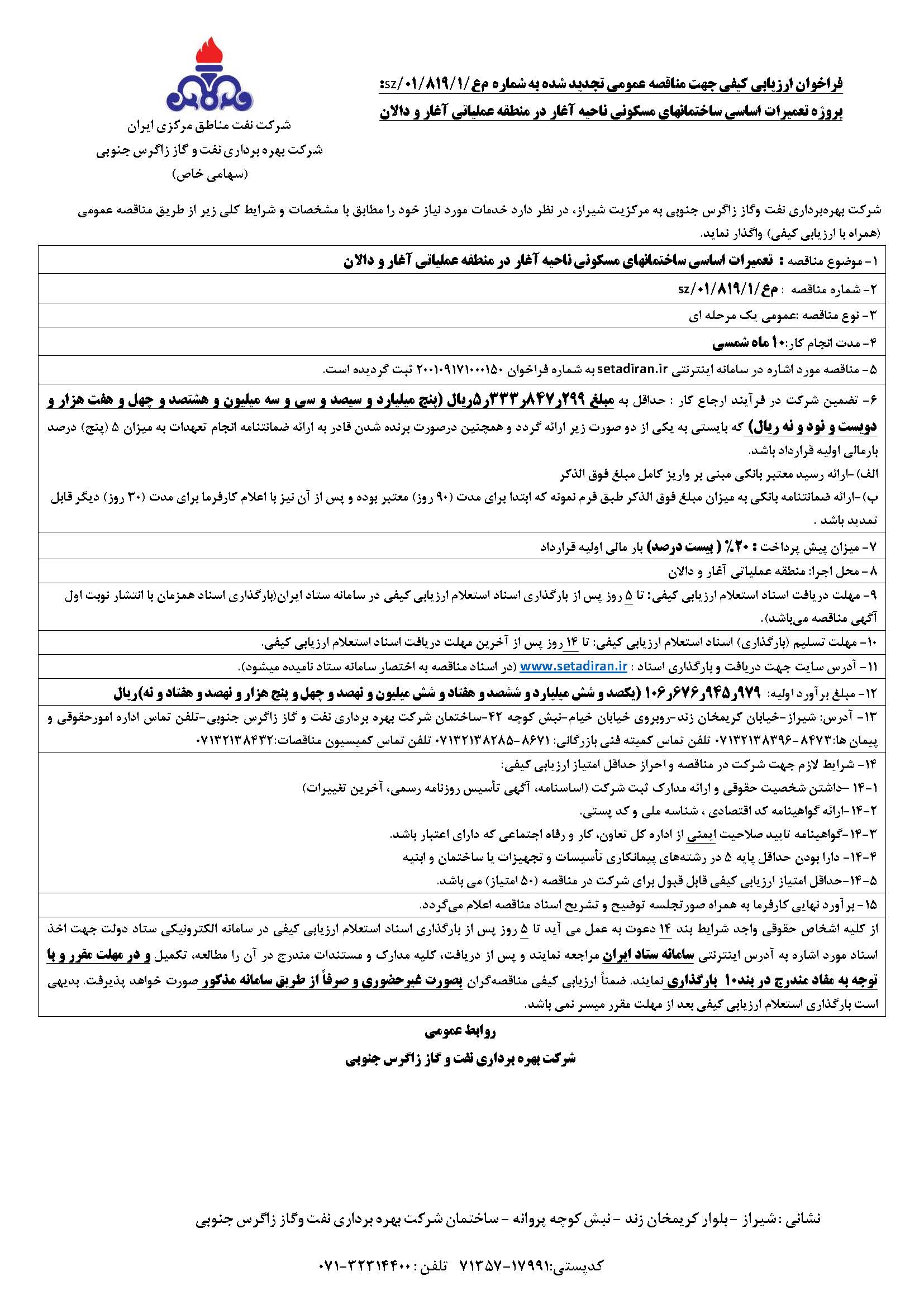 پروژه تعمیرات اساسی ساختمانهای مسکونی ناحیه آغار در منطقه عملیاتی آغار و دالان نوع مناقصه شماره 819 سازمان مرکزی شرکت بهره برداری نفت و گاز زاگرس جنوبی سازمان برگزار کننده شرکت بهره برداری نفت و گاز زاگرس جنوبی نوع برگزاری موضوع حوزه فعالیت توضیح مختصر قیمت پیوست 0 تومان وضعیت انقضا اطلاعات تکمیلی واحدپولی برآورد مالی ریال محدوده داخلی وضعیت برگزاری عادی اطلاعات اسناد محل دریافت اسناد استان: فارس, شهر: شیراز تلفن تماس اداره امورحقوقی و پیمان ها:8473-07132138396 تلفن تماس کمیته فنی بازرگانی: 8671-07132138285 تلفن تماس کمیسیون مناقصات:07132138432 اطلاعات پیوست