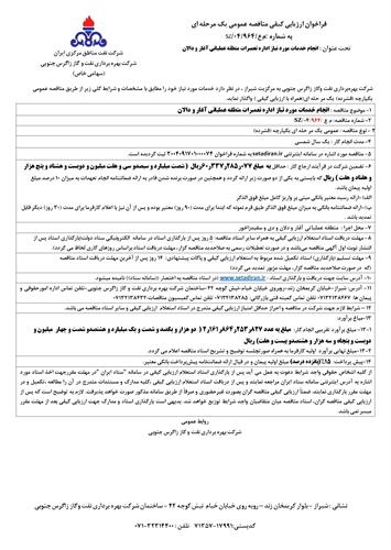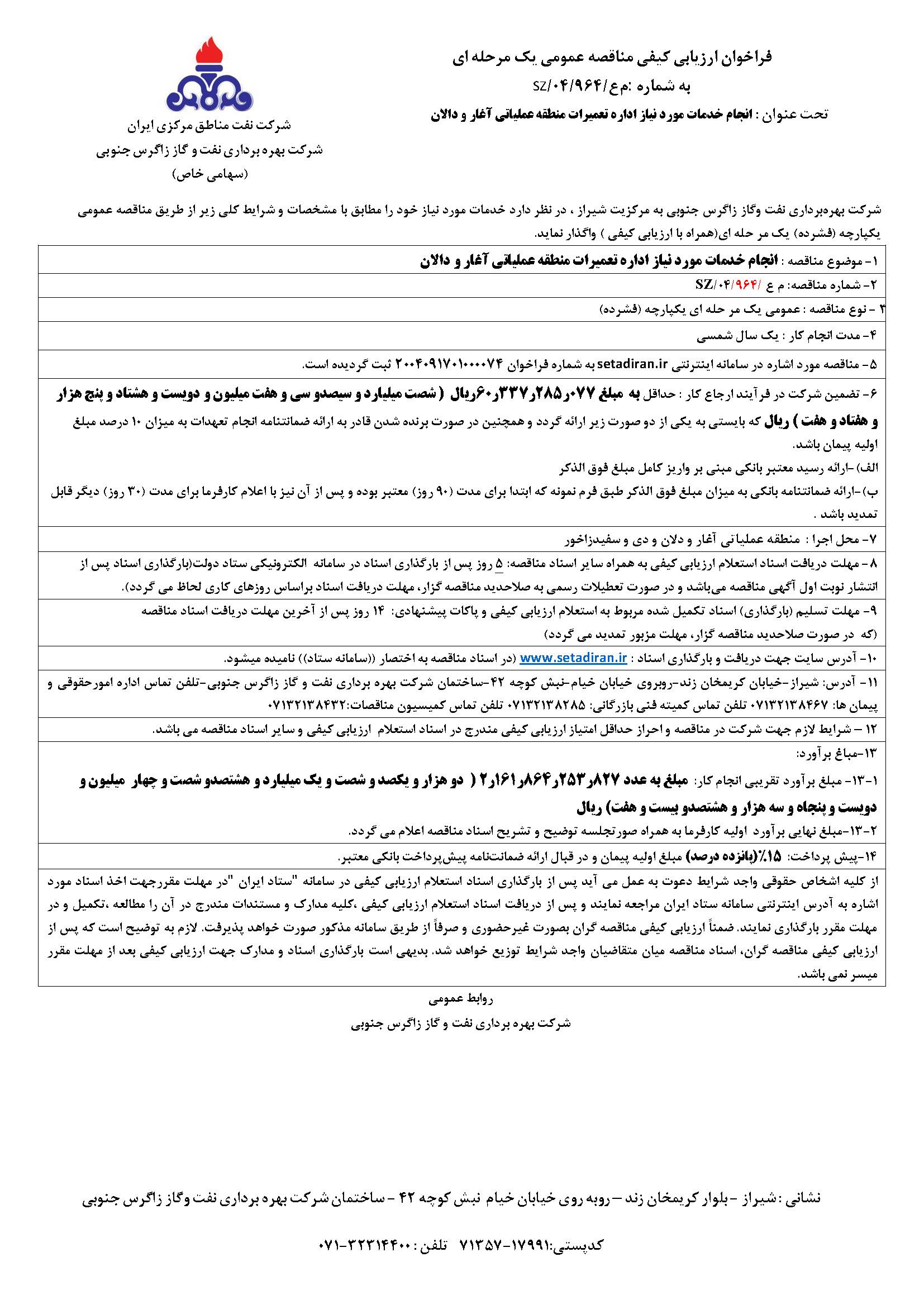 انجام خدمات مورد نیاز اداره تعمیرات منطقه عملیاتی آغار و دالان نوع مناقصه شماره 964 سازمان مرکزی شرکت بهره برداری نفت و گاز زاگرس جنوبی سازمان برگزار کننده شرکت بهره برداری نفت و گاز زاگرس جنوبی نوع برگزاری موضوع حوزه فعالیت توضیح مختصر قیمت پیوست 0 تومان وضعیت انقضا اطلاعات تکمیلی واحدپولی برآورد مالی ریال محدوده داخلی وضعیت برگزاری عادی اطلاعات اسناد محل دریافت اسناد استان: فارس, شهر: شیراز تلفن تماس اداره امورحقوقی و پیمان ها: 07132138467 تلفن تماس کمیته فنی بازرگانی: 07132138285 تلفن تماس کمیسیون مناقصات:07132138432 اطلاعات پیوست