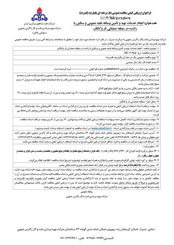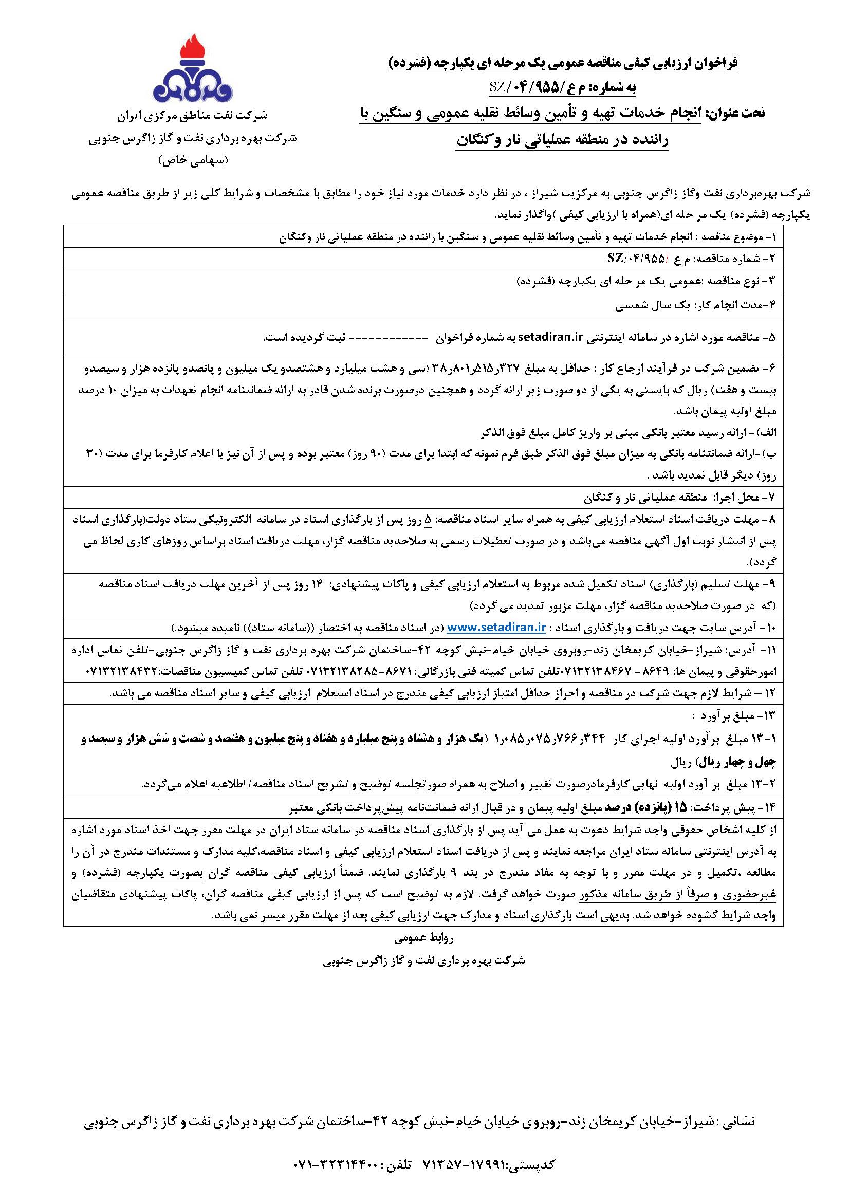 انجام خدمات تهیه و تأمین وسائط نقلیه عمومی و سنگین با راننده در منطقه عملیاتی نار وکنگان نوع مناقصه شماره 955 سازمان مرکزی شرکت بهره برداری نفت و گاز زاگرس جنوبی سازمان برگزار کننده شرکت بهره برداری نفت و گاز زاگرس جنوبی نوع برگزاری موضوع حوزه فعالیت توضیح مختصر قیمت پیوست 0 تومان وضعیت انقضا اطلاعات تکمیلی واحدپولی برآورد مالی ریال محدوده داخلی وضعیت برگزاری عادی اطلاعات اسناد محل دریافت اسناد استان: فارس, شهر: شیراز تلفن تماس اداره امورحقوقی و پیمان ها: 8649- 07132138467تلفن تماس کمیته فنی بازرگانی: 8671-07132138285 تلفن تماس کمیسیون مناقصات:07132138432 اطلاعات پیوست