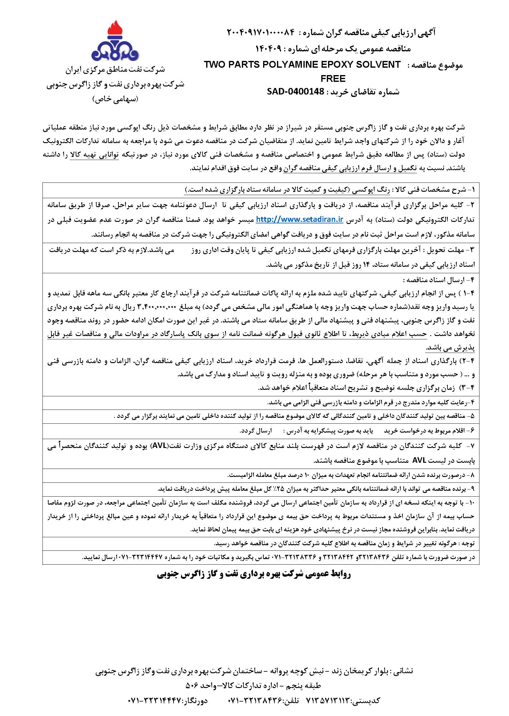تقاضای خرید رنگ اپوکسی مورد نیاز منطقه عملیاتی آغار و دالان نوع مناقصه شماره 140409 سازمان مرکزی شرکت بهره برداری نفت و گاز زاگرس جنوبی سازمان برگزار کننده شرکت بهره برداری نفت و گاز زاگرس جنوبی نوع برگزاری موضوع حوزه فعالیت توضیح مختصر قیمت پیوست 0 تومان وضعیت انقضا اطلاعات تکمیلی واحدپولی برآورد مالی ریال محدوده داخلی وضعیت برگزاری عادی اطلاعات اسناد محل دریافت اسناد استان: فارس, شهر: شیراز در صورت ضرورت با شماره تلفن 32138436و 32138442 و 32138336-071 تماس بگیرید و مکاتبات خود را به شماره 32314447-071 ارسال نمایید. اطلاعات پیوست عنوان اندازه (KB) الزامات بازرسی مناقصه 140409 481.44 پیوست مناقصه 140409 466.22