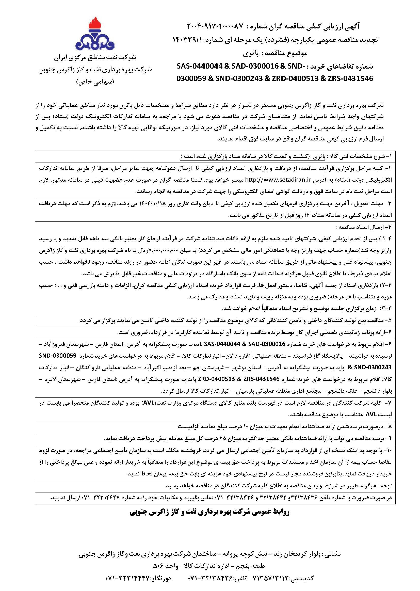 تقاضاهای خرید باتری مورد نیاز مناطق عملیاتی نوع مناقصه شماره 140339/1 سازمان مرکزی شرکت بهره برداری نفت و گاز زاگرس جنوبی سازمان برگزار کننده شرکت بهره برداری نفت و گاز زاگرس جنوبی نوع برگزاری موضوع حوزه فعالیت توضیح مختصر قیمت پیوست 0 تومان وضعیت انقضا اطلاعات تکمیلی واحدپولی برآورد مالی ریال محدوده داخلی وضعیت برگزاری عادی اطلاعات اسناد محل دریافت اسناد استان: فارس, شهر: شیراز در صورت ضرورت با شماره تلفن 32138436و 32138442 و 32138336-071 تماس بگیرید و مکاتبات خود را به شماره 32314447-071 ارسال نمایید. اطلاعات پیوست عنوان اندازه (KB) پیوست مناقصه 140339/1 575.66