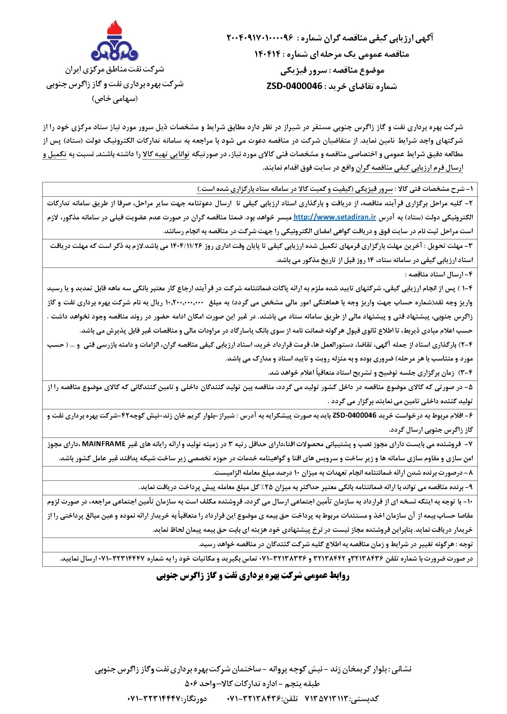 تقاضای خرید سرور مورد نیاز ستاد مرکزی نوع مناقصه شماره 140414 سازمان مرکزی شرکت بهره برداری نفت و گاز زاگرس جنوبی سازمان برگزار کننده شرکت بهره برداری نفت و گاز زاگرس جنوبی نوع برگزاری موضوع حوزه فعالیت توضیح مختصر قیمت پیوست 0 تومان وضعیت انقضا اطلاعات تکمیلی واحدپولی برآورد مالی ریال محدوده داخلی وضعیت برگزاری عادی اطلاعات اسناد محل دریافت اسناد استان: فارس, شهر: شیراز در صورت ضرورت با شماره تلفن 32138436و 32138442 و 32138336-071 تماس بگیرید و مکاتبات خود را به شماره 32314447-071 ارسال نمایید. اطلاعات پیوست عنوان اندازه (KB) پیوست مناقصه 140414 561.50