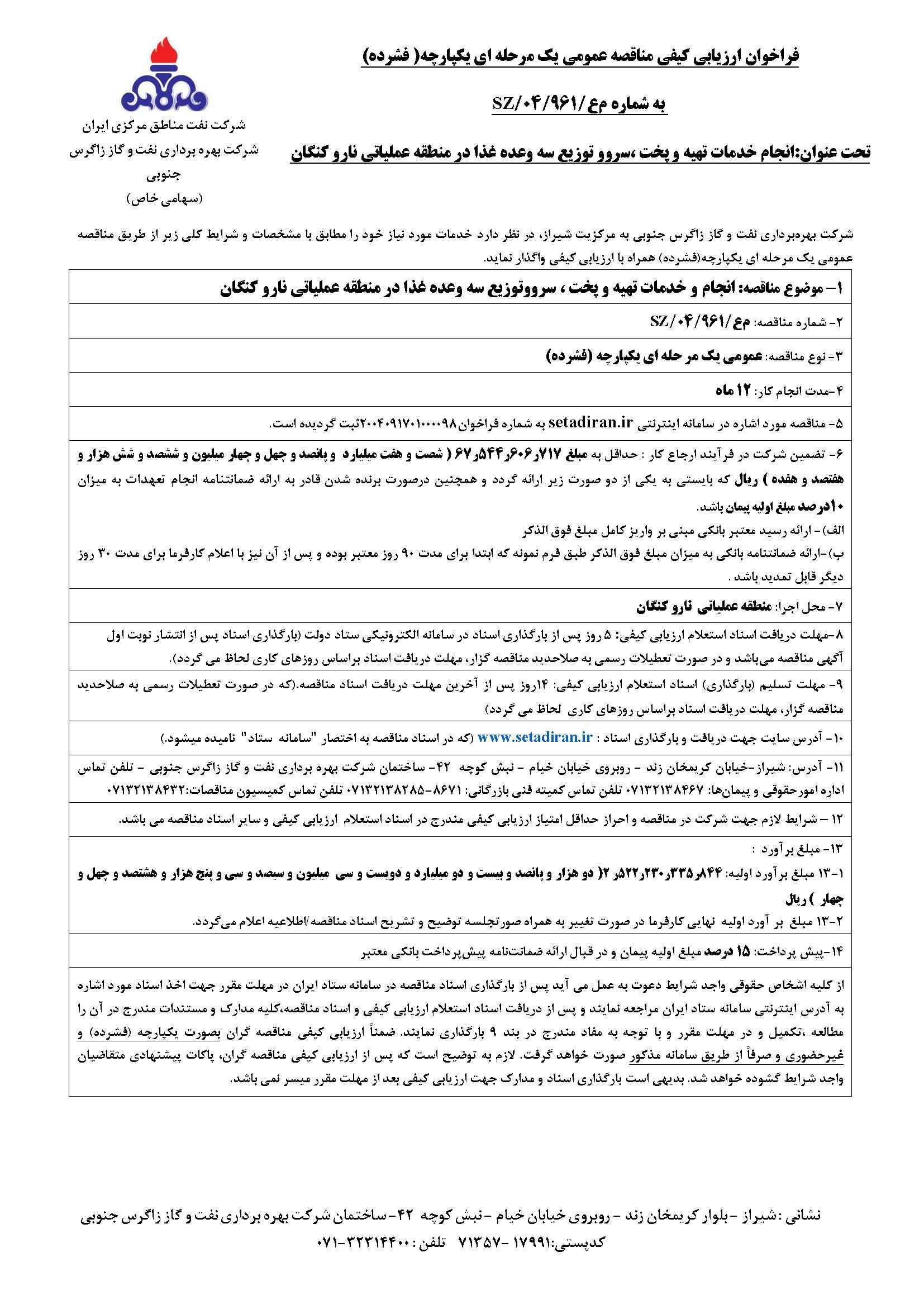 انجام خدمات تهیه و پخت ،سروو توزیع سه وعده غذا در منطقه عملیاتی نارو کنگان نوع مناقصه شماره 961 سازمان مرکزی شرکت بهره برداری نفت و گاز زاگرس جنوبی سازمان برگزار کننده شرکت بهره برداری نفت و گاز زاگرس جنوبی نوع برگزاری موضوع حوزه فعالیت توضیح مختصر قیمت پیوست 0 تومان وضعیت انقضا اطلاعات تکمیلی واحدپولی برآورد مالی ریال محدوده داخلی وضعیت برگزاری عادی اطلاعات اسناد محل دریافت اسناد استان: فارس, شهر: شیراز تلفن تماس اداره امورحقوقی و پیمان ها: 07132138584 تلفن تماس کمیته فنی بازرگانی: 8671-07132138285 تلفن تماس کمیسیون مناقصات:07132138432 اطلاعات پیوست