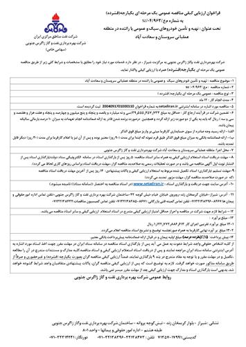 تهیه و تأمین خودروهای سبک و عمومی با راننده در منطقه عملیاتی سروستان و سعادت آباد نوع مناقصه شماره 963 سازمان مرکزی شرکت بهره برداری نفت و گاز زاگرس جنوبی سازمان برگزار کننده شرکت بهره برداری نفت و گاز زاگرس جنوبی نوع برگزاری موضوع حوزه فعالیت توضیح مختصر قیمت پیوست 0 تومان وضعیت انقضا اطلاعات تکمیلی واحدپولی برآورد مالی ریال محدوده داخلی وضعیت برگزاری عادی اطلاعات اسناد محل دریافت اسناد استان: فارس, شهر: شیراز تلفن تماس اداره امورحقوقی و پیمان ها:8467-07132138396 تلفن تماس کمیته فنی بازرگانی: 8671-07132138285 تلفن تماس کمیسیون مناقصات:07132138432 اطلاعات پیوست