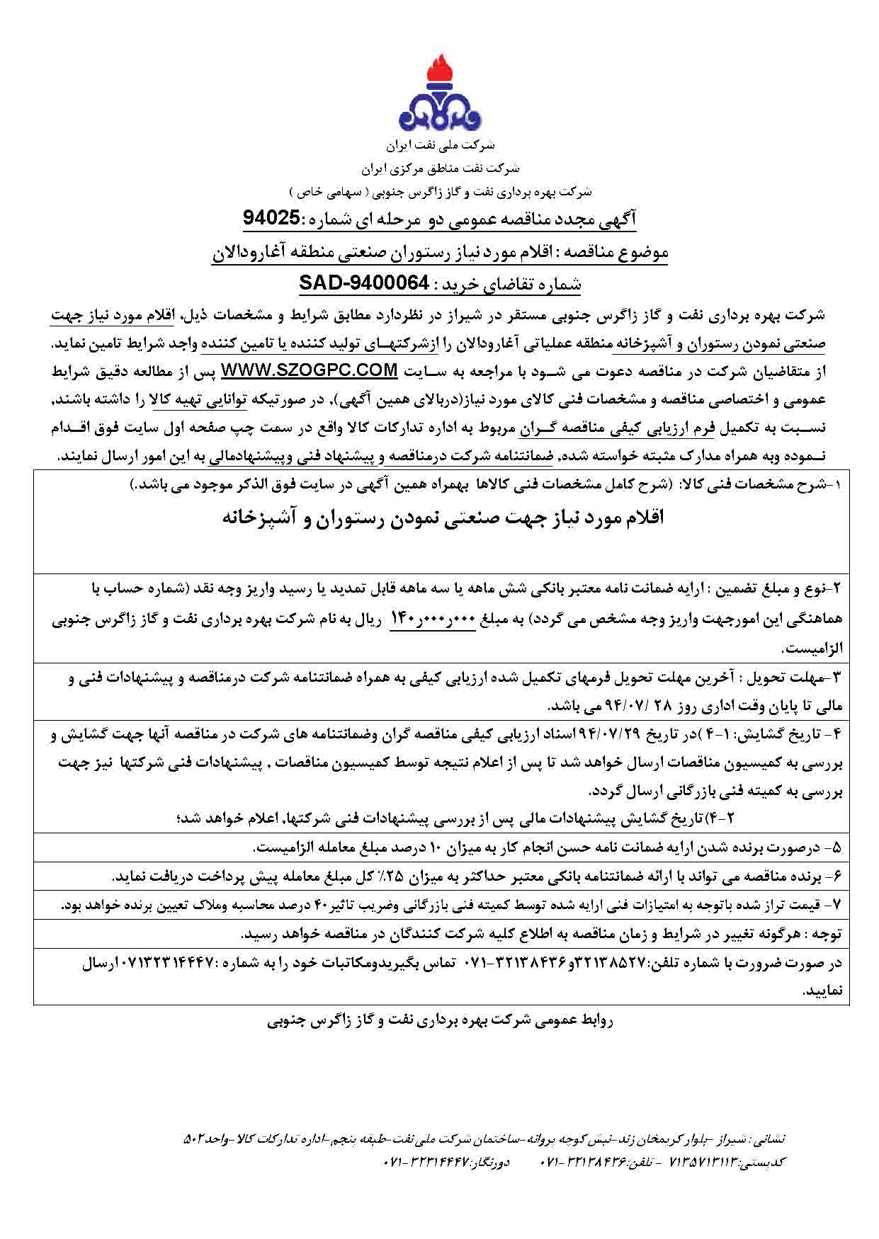 تقاضای خرید اقلام مورد نیاز جهت صنعتی نمودن رستوران و آشپزخانه منطقه عملیاتی آغارودالان نوع مناقصه شماره 94025 سازمان مرکزی شرکت بهره برداری نفت و گاز زاگرس جنوبی سازمان برگزار کننده شرکت بهره برداری نفت و گاز زاگرس جنوبی نوع برگزاری موضوع حوزه فعالیت توضیح مختصر قیمت پیوست 0 تومان وضعیت انقضا اطلاعات تکمیلی واحدپولی برآورد مالی ریال محدوده داخلی وضعیت برگزاری عادی اطلاعات اسناد مهلت دریافت سند ۲۸ مهر ۱۳۹۴ ۱۳:۴۷ محل دریافت اسناد استان: فارس, شهر: شیراز در صورت ضرورت با شماره تلفن:32138527و32138436-071 تماس بگیریدومکاتبات خود را به شماره :07132314447 ارسال نمایید. توضیحات اسناد فرم اعلام وصول مناقصه شرایط عمومی و اختصاصی مناقصه اطلاعات پیوست