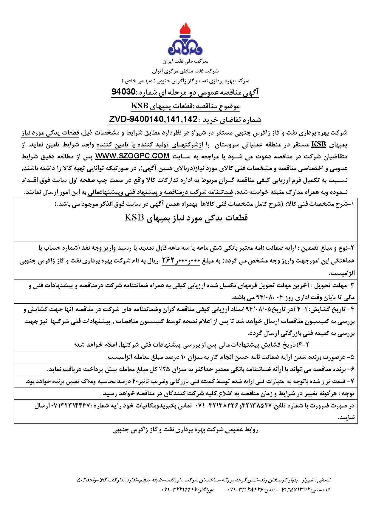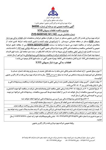 تقاضای خرید قطعات یدکی مورد نیاز پمپهای KSB مستقر در منطقه عملیاتی سروستان نوع مناقصه شماره 94030 سازمان مرکزی شرکت بهره برداری نفت و گاز زاگرس جنوبی سازمان برگزار کننده شرکت بهره برداری نفت و گاز زاگرس جنوبی نوع برگزاری موضوع حوزه فعالیت توضیح مختصر قیمت پیوست 0 تومان وضعیت انقضا اطلاعات تکمیلی واحدپولی برآورد مالی ریال محدوده داخلی وضعیت برگزاری عادی اطلاعات اسناد مهلت دریافت سند ۴ آبان ۱۳۹۴ ۱۳:۵۸ محل دریافت اسناد استان: فارس, شهر: شیراز در صورت ضرورت با شماره تلفن:32138527و32138436-071 تماس بگیریدومکاتبات خود را به شماره :07132314447 ارسال نمایید. توضیحات اسناد فرم اعلام وصول مناقصه شرایط عمومی و اختصاصی مناقصه ZVD-9400140 نقشه پمپ ZVD-9400141 نقشه پمپ ZVD-9400142 نقشه پمپ اطلاعات پیوست