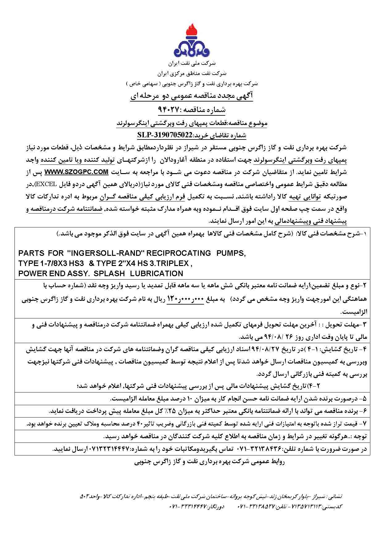 تقاضای خرید قطعات مورد نیاز پمپهای رفت وبرگشتی اینگرسولرند جهت استفاده در منطقه آغارودالان نوع مناقصه شماره 94027 سازمان مرکزی شرکت بهره برداری نفت و گاز زاگرس جنوبی سازمان برگزار کننده شرکت بهره برداری نفت و گاز زاگرس جنوبی نوع برگزاری موضوع حوزه فعالیت توضیح مختصر قیمت پیوست 0 تومان وضعیت انقضا اطلاعات تکمیلی واحدپولی برآورد مالی ریال محدوده داخلی وضعیت برگزاری عادی اطلاعات اسناد مهلت دریافت سند ۲۷ آبان ۱۳۹۴ ۱۵:۲۰ محل دریافت اسناد استان: فارس, شهر: شیراز در صورت ضرورت با شماره تلفن:32138436-071 تماس بگیریدومکاتبات خود را به شماره:07132314447 ارسال نمایید. توضیحات اسناد فرم اعلام وصول مناقصه شرایط عمومی و اختصاصی مناقصه اطلاعات پیوست