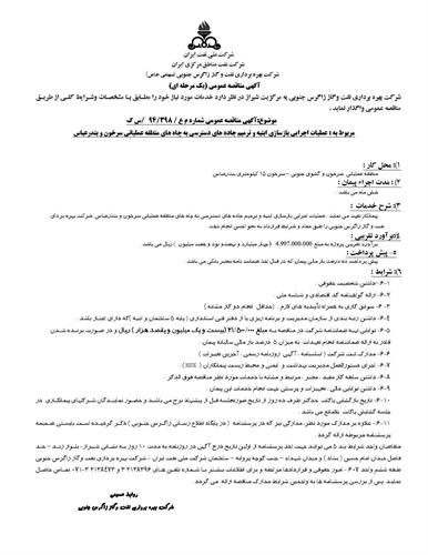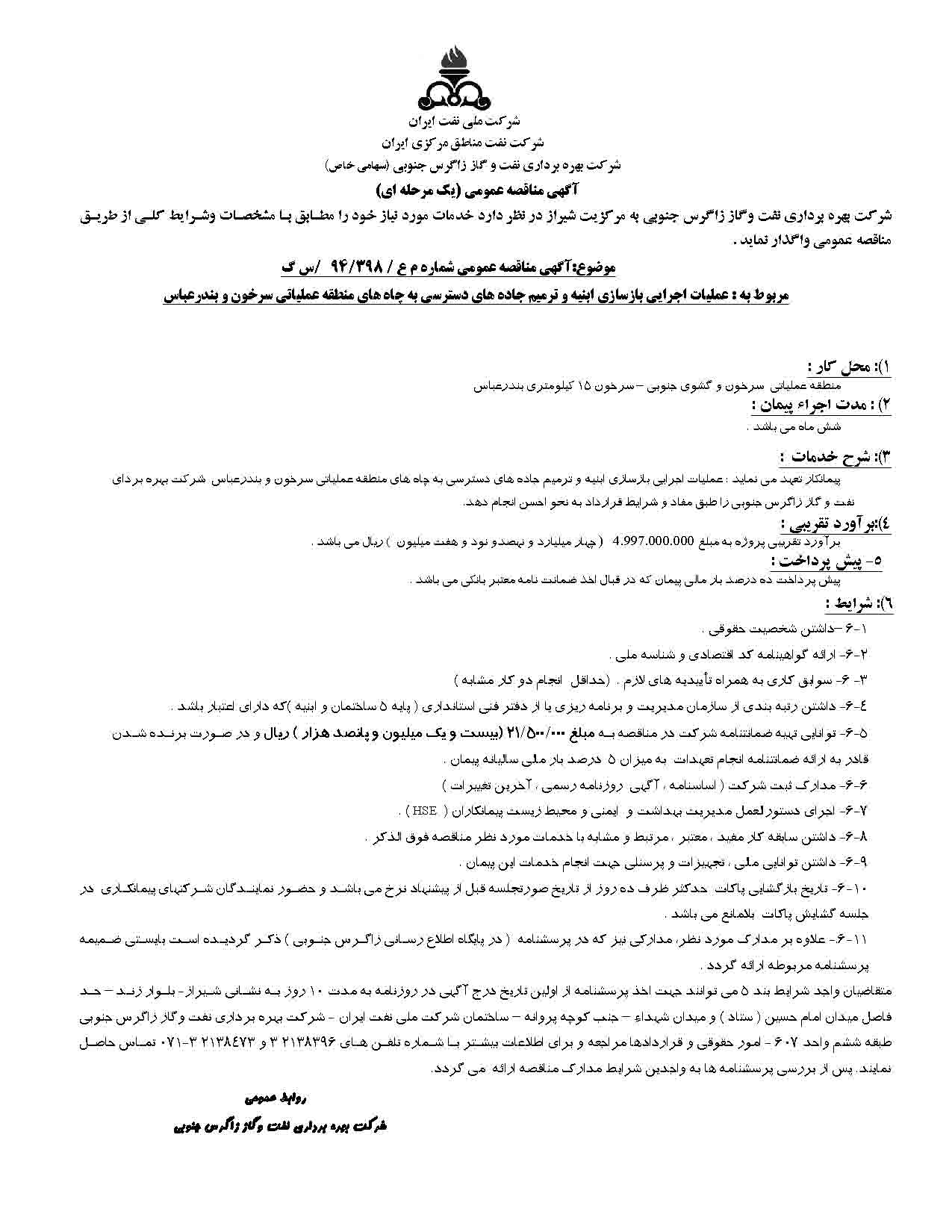 مربوط به : عملیات اجرایی بازسازی ابنیه و ترمیم جاده های دسترسی به چاه های منطقه عملیاتی سرخون و بندرعباس نوع مناقصه شماره م ع / 398/94 /س گ سازمان مرکزی شرکت بهره برداری نفت و گاز زاگرس جنوبی سازمان برگزار کننده شرکت بهره برداری نفت و گاز زاگرس جنوبی نوع برگزاری موضوع حوزه فعالیت توضیح مختصر قیمت پیوست 0 تومان وضعیت انقضا اطلاعات تکمیلی واحدپولی برآورد مالی ریال محدوده داخلی وضعیت برگزاری عادی اطلاعات اسناد مهلت دریافت سند ۷ آذر ۱۳۹۴ ۱۴:۳۵ محل دریافت اسناد استان: فارس, شهر: شیراز متقاضیان واجد شرایط بند 5 می توانند جهت اخذ پرسشنامه از اولین تاریخ درج آگهی در روزنامه به مدت 10 روز به نشانی شیراز- بلوار زند – حد فاصل میدان امام حسین ( ستاد ) و میدان شهداء – جنب کوچه پروانه – ساختمان شرکت ملی نفت ایران - شرکت بهره برداری نفت وگاز زاگرس جنوبی طبقه ششم واحد 607 - امور حقوقی و قراردادها مراجعه و برای اطلاعات بیشتر با شماره تلفن های 2138396 3 و 2138473 3-071 تماس حاصل نمایند. پس از بررسی پرسشنامه ها به واجدین شرایط مدارک مناقصه ارائه می گردد. اطلاعات پیوست