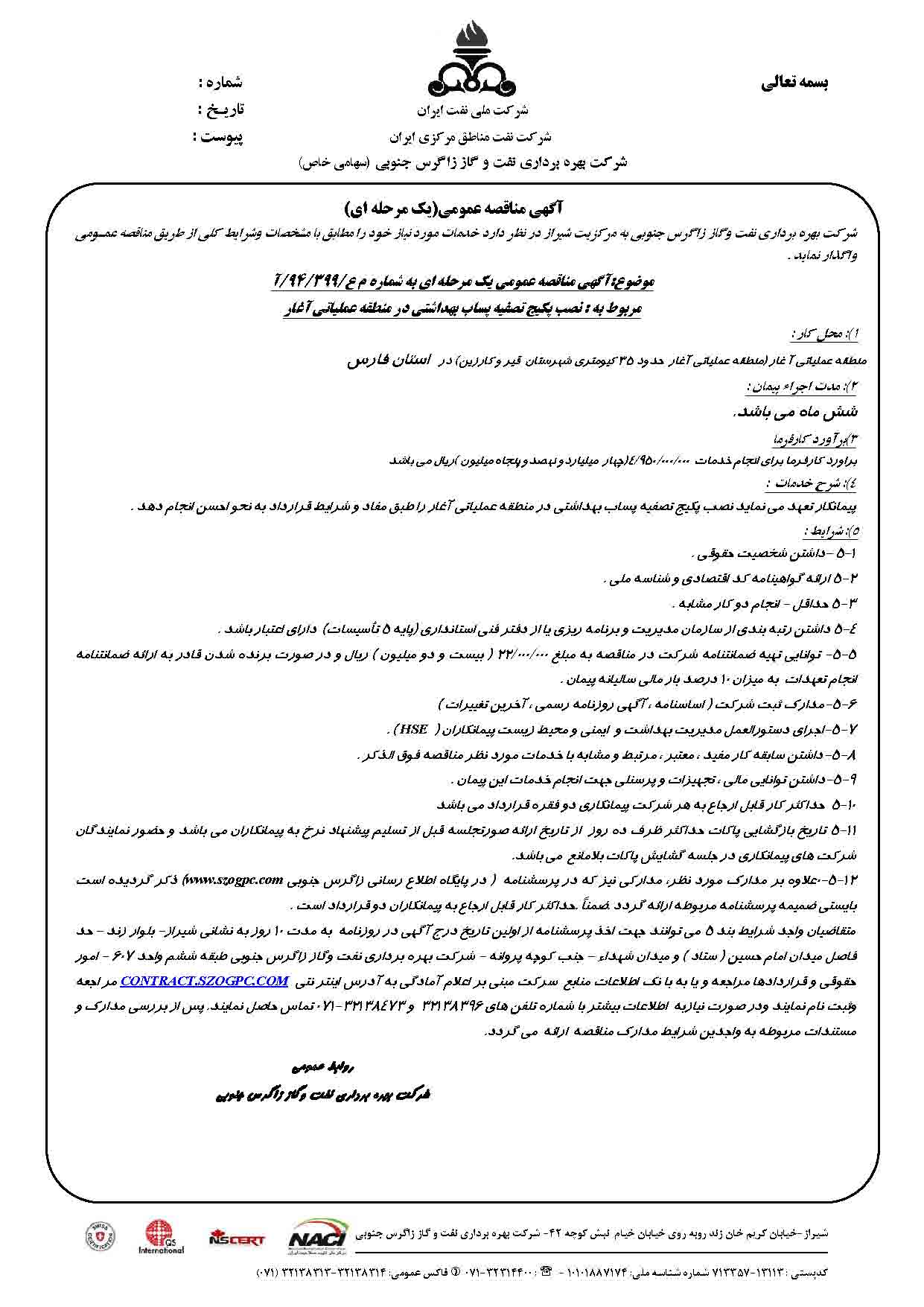 متقاضیان واجد شرایط بند 5 می توانند جهت اخذ پرسشنامه از اولین تاریخ درج آگهی در روزنامه به مدت 10 روز به نشانی شیراز- بلوار زند – حد فاصل میدان امام حسین ( ستاد ) و میدان شهداء – جنب کوچه پروانه - شرکت بهره برداری نفت وگاز زاگرس جنوبی طبقه ششم واحد 607 - امور حقوقی و قراردادها مراجعه و یا به با نک اطلاعات منابع سرکت مبنی بر اعلام آمادگی به آدرس اینتر نتی CONTRACT.SZOGPC.COMمر اجعه وثبت نام نمایند ودر صورت نیازبه اطلاعات بیشتر با شماره تلفن های 32138396 و 32138473-071 تماس حاصل نمایند. پس از بررسی مدارک و مستندات مربوطه به واجدین شرایط مدارک مناقصه ارائه می گردد.