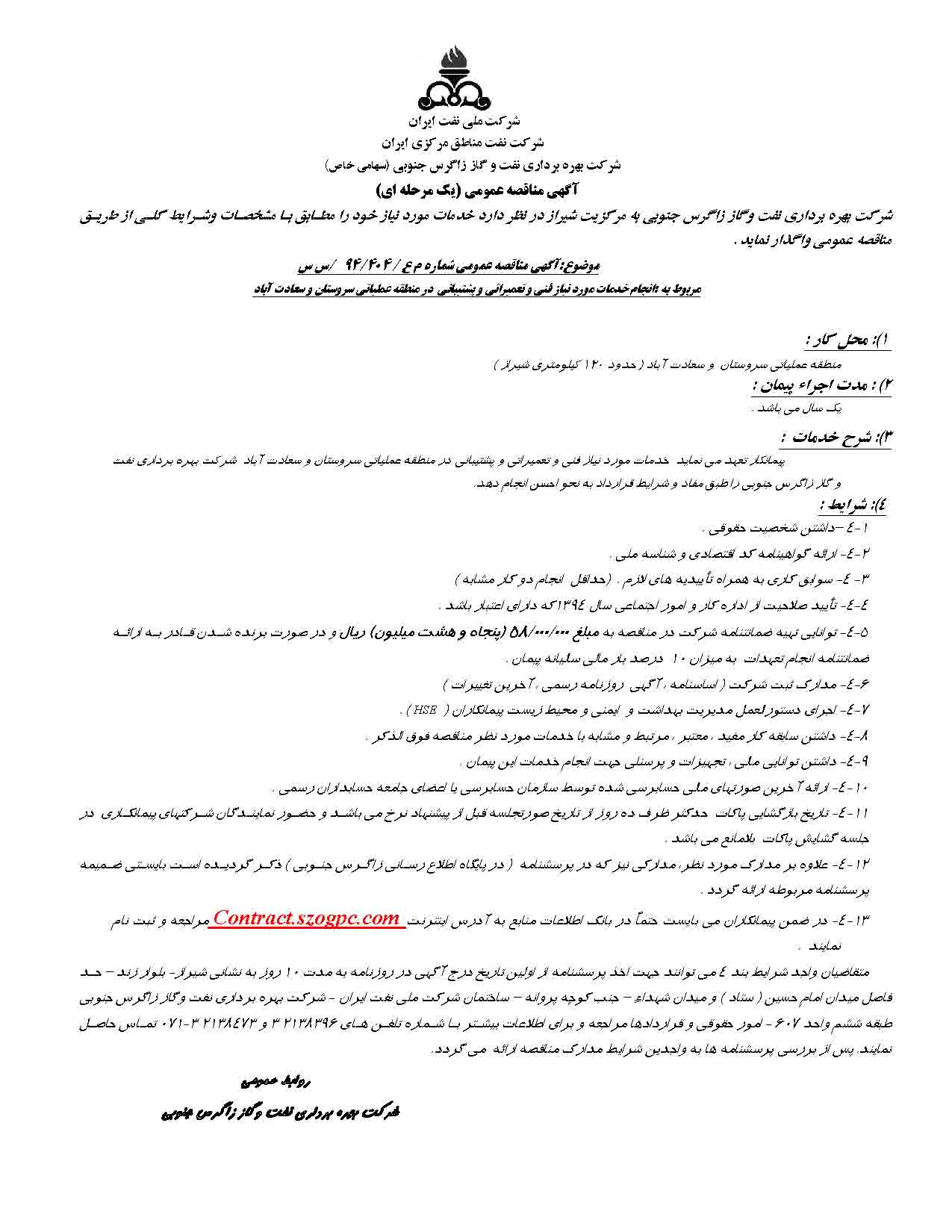 مربوط به :انجام خدمات مورد نیاز فنی و تعمیراتی و پشتیبانی در منطقه عملیاتی سروستان و سعادت آباد نوع مناقصه شماره م ع / 404/94/س س سازمان مرکزی شرکت بهره برداری نفت و گاز زاگرس جنوبی سازمان برگزار کننده شرکت بهره برداری نفت و گاز زاگرس جنوبی نوع برگزاری موضوع حوزه فعالیت توضیح مختصر قیمت پیوست 0 تومان وضعیت انقضا اطلاعات تکمیلی واحدپولی برآورد مالی ریال محدوده داخلی وضعیت برگزاری عادی اطلاعات اسناد مهلت دریافت سند ۱۰ دی ۱۳۹۴ ۱۴:۲۴ محل دریافت اسناد استان: فارس, شهر: شیراز در ضمن پیمانکاران می بایست حتماٌ در بانک اطلاعات منابع به آدرس اینترنتContract.szogpc.com مراجعه و ثبت نام نمایند . متقاضیان واجد شرایط بند 4 می توانند جهت اخذ پرسشنامه از اولین تاریخ درج آگهی در روزنامه به مدت 10 روز به نشانی شیراز- بلوار زند – حد فاصل میدان امام حسین ( ستاد ) و میدان شهداء – جنب کوچه پروانه – ساختمان شرکت ملی نفت ایران - شرکت بهره برداری نفت وگاز زاگرس جنوبی طبقه ششم واحد 607 - امور حقوقی و قراردادها مراجعه و برای اطلاعات بیشتر با شماره تلفن های 2138396 3 و 2138473 3-071 تماس حاصل نمایند. پس از بررسی پرسشنامه ها به واجدین شرایط مدارک مناقصه ارائه می گردد. اطلاعات پیوست
