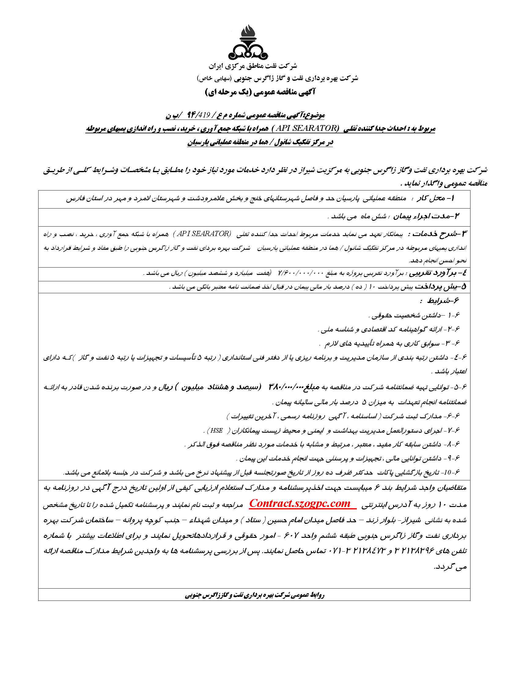 متقاضیان واجد شرایط بند 6 میبایست جهت اخذپرسشنامه و مدارک استعلام ارزیابی کیفی از اولین تاریخ درج آگهی در روزنامه به مدت 10 روز به آدرس اینترنتی Contract.szogpc.com مراجعه و ثبت نام نمایند و پرسشنامه تکمیل شده را تا تاریخ مشخص شده به نشانی شیراز- بلوار زند – حد فاصل میدان امام حسین ( ستاد ) و میدان شهداء – جنب کوچه پروانه – ساختمان شرکت بهره برداری نفت وگاز زاگرس جنوبی طبقه ششم واحد 607 - امور حقوقی و قراردادهاتحویل نمایند و برای اطلاعات بیشتر با شماره تلفن های 2138396 3 و 2138473 3-071 تماس حاصل نمایند. پس از بررسی پرسشنامه ها به واجدین شرایط مدارک مناقصه ارائه می گردد.