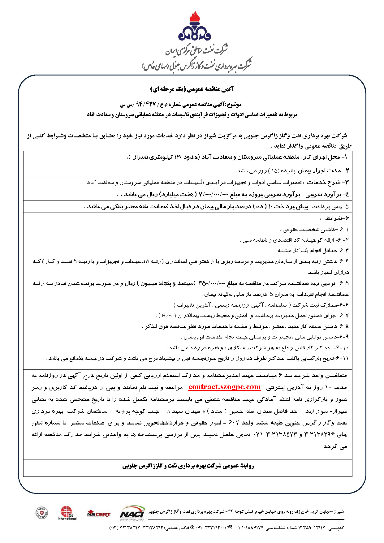 مربوط به :تعمیرات اساسی ادوات و تجهیزات فرآیندی تأسیسات در منطقه عملیاتی سروستان و سعادت آباد نوع مناقصه شماره م ع/ 427/94 /س س سازمان مرکزی شرکت بهره برداری نفت و گاز زاگرس جنوبی سازمان برگزار کننده شرکت بهره برداری نفت و گاز زاگرس جنوبی نوع برگزاری موضوع حوزه فعالیت توضیح مختصر قیمت پیوست 0 تومان وضعیت انقضا اطلاعات تکمیلی واحدپولی برآورد مالی ریال محدوده داخلی وضعیت برگزاری عادی اطلاعات اسناد مهلت دریافت سند ۸ اسفند ۱۳۹۴ ۰۹:۳۰ محل دریافت اسناد استان: فارس, شهر: شیراز متقاضیان واجد شرایط بند 6 میبایست جهت اخذپرسشنامه و مدارک استعلام ارزیابی کیفی از اولین تاریخ درج آگهی در روزنامه به مدت 10 روز به آدرس اینترنتی contract.szogpc.com مراجعه و ثبت نام نمایند و پس از دریافت کد کاربری و رمز عبور و بارگزاری نامه اعلام آمادگی جهت مناقصه عطفی می بایست پرسشنامه تکمیل شده را تا تاریخ مشخص شده به نشانی شیراز- بلوار زند – حد فاصل میدان امام حسین ( ستاد ) و میدان شهداء – جنب کوچه پروانه – ساختمان شرکت بهره برداری نفت وگاز زاگرس جنوبی طبقه ششم واحد 607 - امور حقوقی و قراردادهاتحویل نمایند و برای اطلاعات بیشتر با شماره تلفن های 2138396 3 و 2138473 3-071 تماس حاصل نمایند. پس از بررسی پرسشنامه ها به واجدین شرایط مدارک مناقصه ارائه می گردد. اطلاعات پیوست