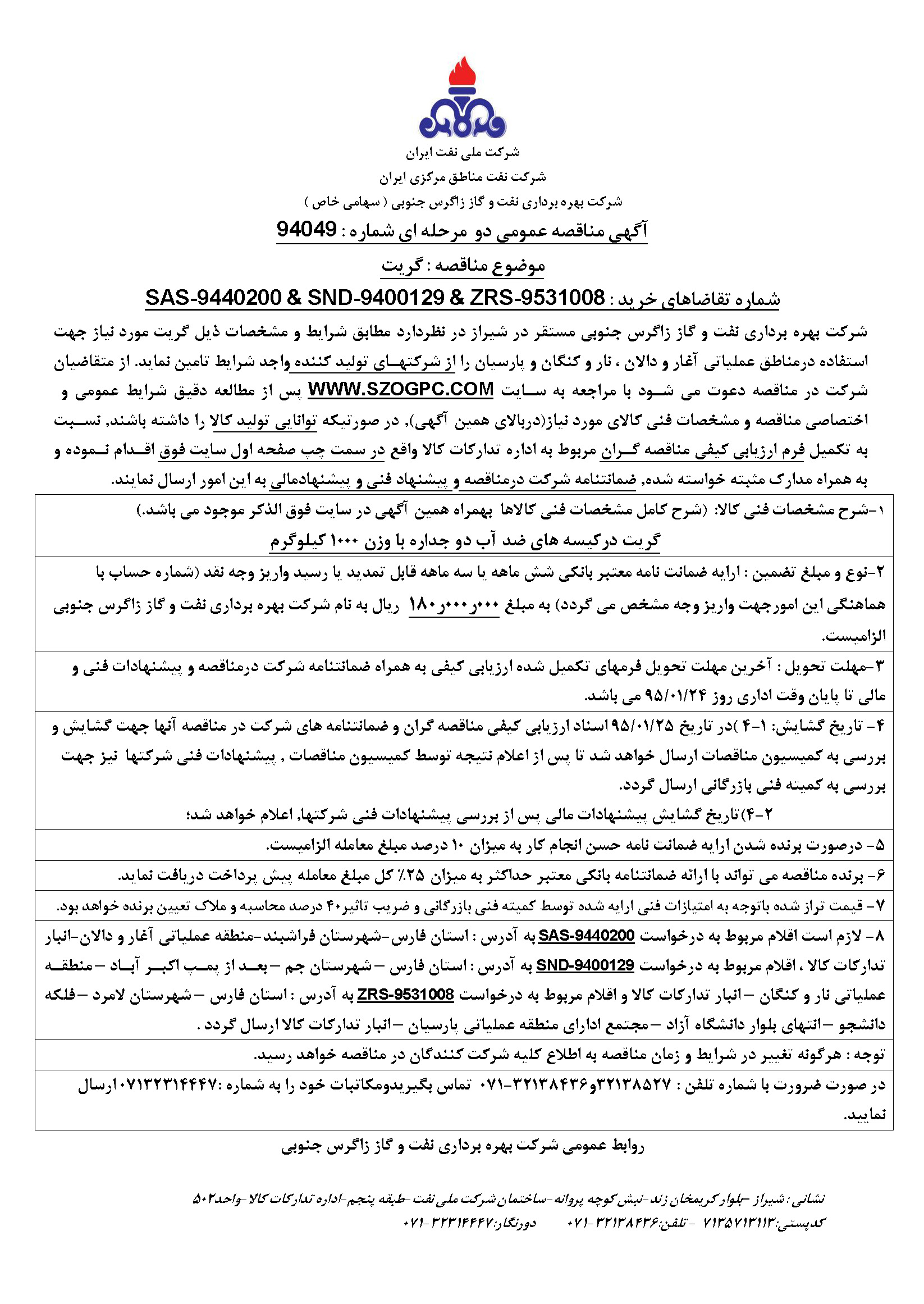 تقاضای خرید گریت مورد نیاز جهت استفاده درمناطق عملیاتی