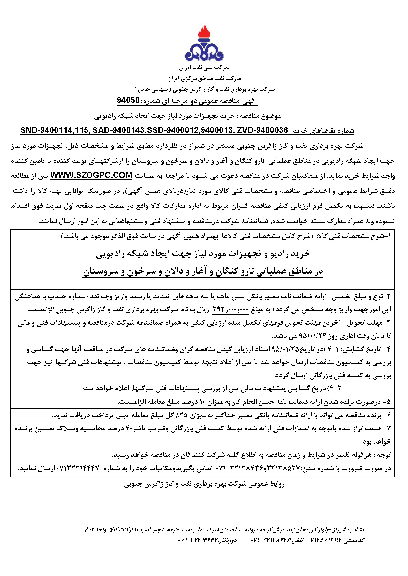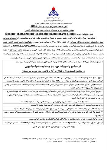 تقاضای خرید تجهیزات مورد نیاز جهت ایجاد شبکه رادیویی در مناطق عملیاتی نوع مناقصه شماره 94050 سازمان مرکزی شرکت بهره برداری نفت و گاز زاگرس جنوبی سازمان برگزار کننده شرکت بهره برداری نفت و گاز زاگرس جنوبی نوع برگزاری موضوع حوزه فعالیت توضیح مختصر قیمت پیوست 0 تومان وضعیت انقضا اطلاعات تکمیلی واحدپولی برآورد مالی ریال محدوده داخلی وضعیت برگزاری عادی اطلاعات اسناد محل دریافت اسناد استان: فارس, شهر: شیراز در صورت ضرورت با شماره تلفن : ۳۲۱۳۸۵۲۷و۳۲۱۳۸۴۳۶-۰۷۱ تماس بگیریدومکاتبات خود را به شماره : ۰۷۱۳۲۳۱۴۴۴۷ ارسال نمایید. توضیحات اسناد فرم اعلام وصول مناقصه شرایط عمومی و اختصاصی مناقصه اطلاعات پیوست