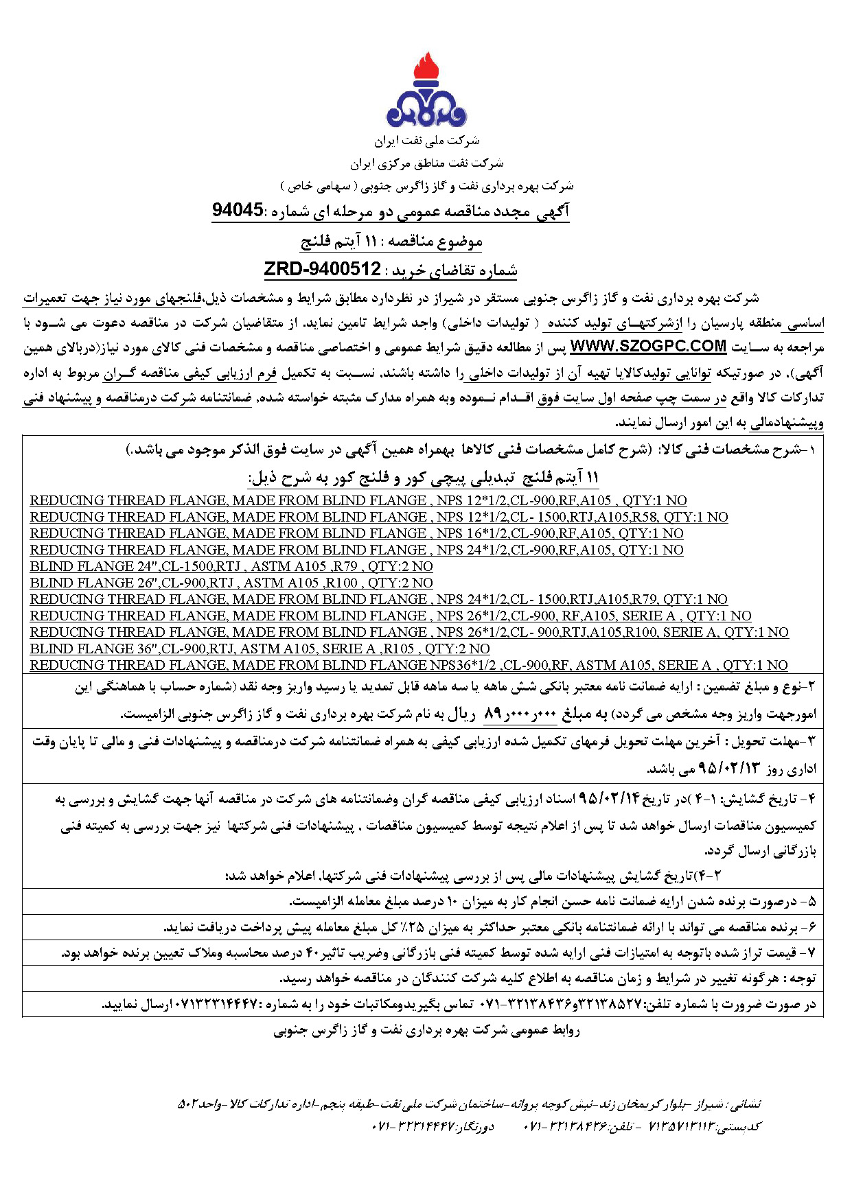 تقاضای خرید فلنجهای مورد نیاز جهت تعمیرات اساسی منطقه پارسیان