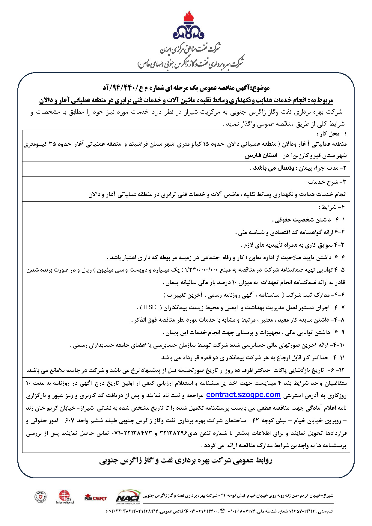 مربوط به : انجام خدمات هدایت و نگهداری وسائط نقلیه ، ماشین آلات و خدمات فنی ترابری در منطقه عملیاتی آغار و دالان نوع مناقصه شماره م ع/440/94/آد سازمان مرکزی شرکت بهره برداری نفت و گاز زاگرس جنوبی سازمان برگزار کننده شرکت بهره برداری نفت و گاز زاگرس جنوبی نوع برگزاری موضوع حوزه فعالیت توضیح مختصر قیمت پیوست 0 تومان وضعیت انقضا اطلاعات تکمیلی واحدپولی برآورد مالی ریال محدوده داخلی وضعیت برگزاری عادی اطلاعات اسناد مهلت دریافت سند ۲۸ اردیبهشت ۱۳۹۵ ۱۰:۱۴ محل دریافت اسناد استان: فارس, شهر: شیراز متقاضیان واجد شرایط بند 4 میبایست جهت اخذ پر سشنامه و استعلام ارزیابی کیفی از اولین تاریخ درج آگهی در روزنامه به مدت 10 روزکاری به آدرس اینترنتی contract.szogpc.com مراجعه و ثبت نام نمایند و پس از دریافت کد کاربری و رمز عبور و بارگزاری نامه اعلام آمادگی جهت مناقصه عطفی می بایست پرسشنامه تکمیل شده را تا تاریخ مشخص شده به نشانی شیراز- خیابان کریم خان زند – روبروی خیابان خیام – نبش کوچه 42 - ساختمان شرکت بهره برداری نفت وگاز زاگرس جنوبی طبقه ششم واحد 607 - امور حقوقی و قراردادها تحویل نمایند و برای اطلاعات بیشتر با شماره تلفن های32138396 و 32138473-071 تماس حاصل نمایند. پس از بررسی پرسشنامه ها به واجدین شرایط مدارک مناقصه ارائه می گردد . اطلاعات پیوست