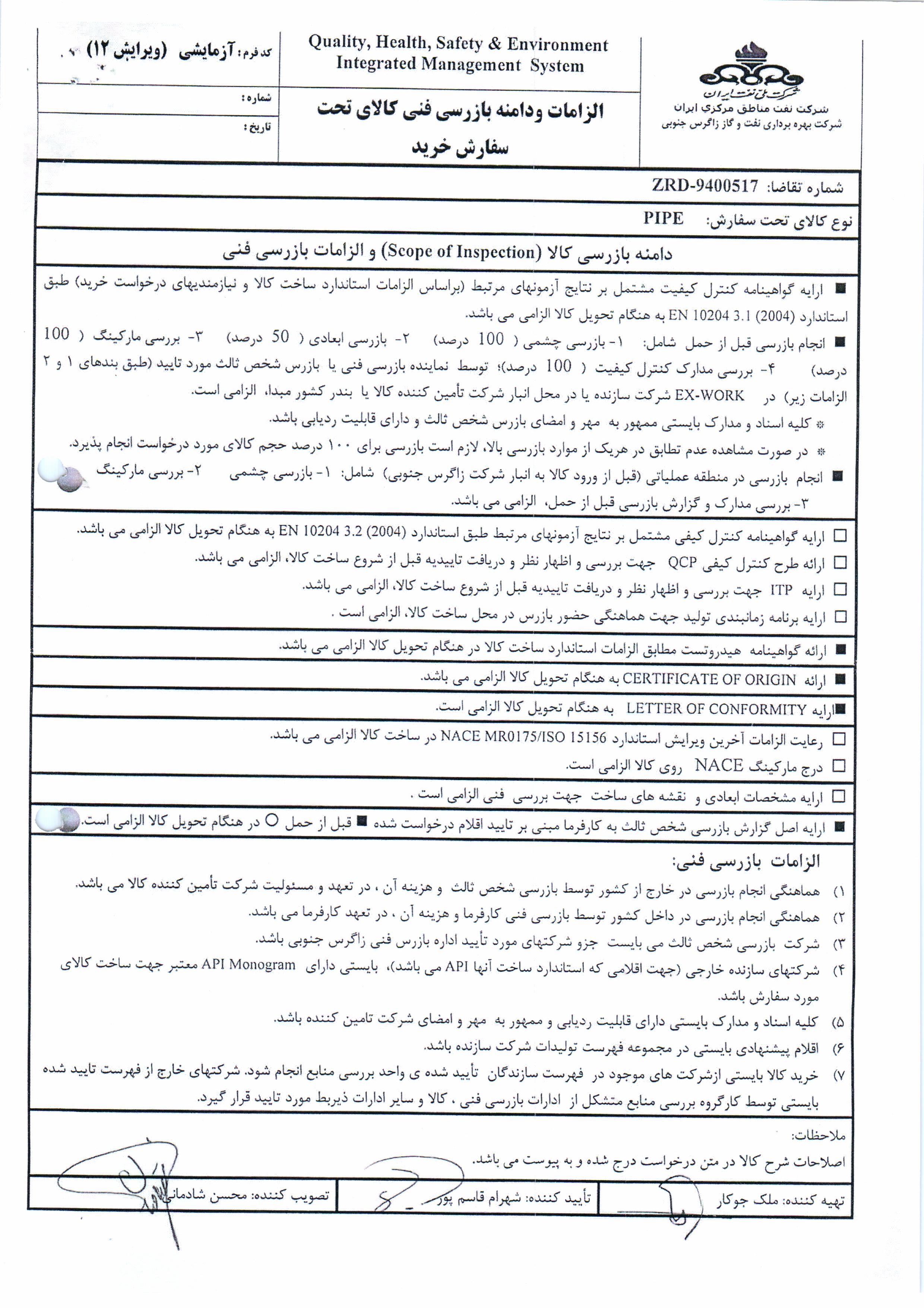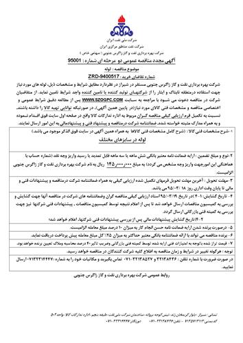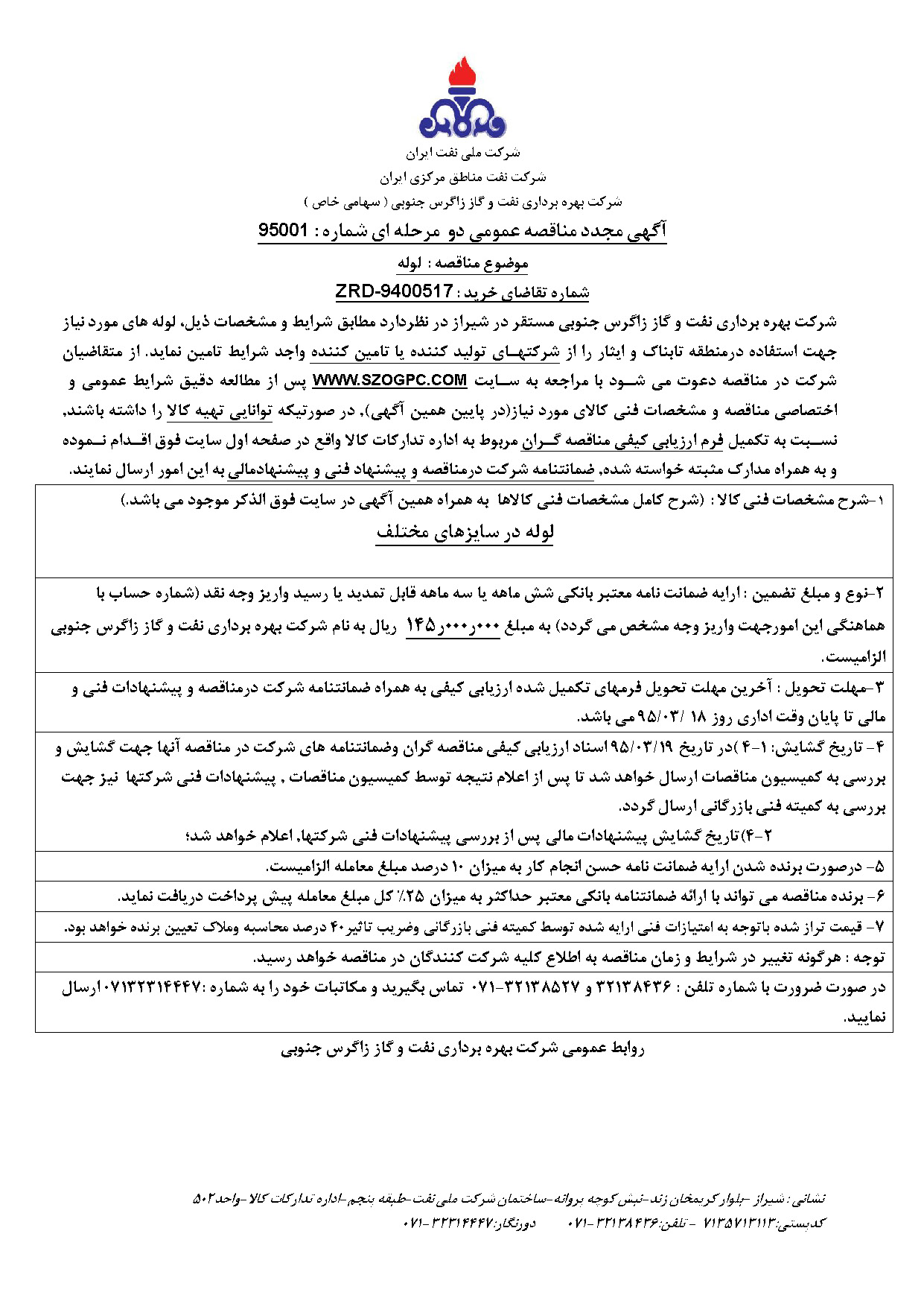 آگهی مجدد تقاضای خرید لوله های مورد نیاز جهت استفاده درمنطقه تابناک و ایثار نوع مناقصه شماره 95001 سازمان مرکزی شرکت بهره برداری نفت و گاز زاگرس جنوبی سازمان برگزار کننده شرکت بهره برداری نفت و گاز زاگرس جنوبی نوع برگزاری موضوع حوزه فعالیت توضیح مختصر قیمت پیوست 0 تومان وضعیت انقضا اطلاعات تکمیلی واحدپولی برآورد مالی ریال محدوده داخلی وضعیت برگزاری عادی اطلاعات اسناد مهلت دریافت سند ۱۸ خرداد ۱۳۹۵ ۱۱:۳۱ محل دریافت اسناد استان: فارس, شهر: شیراز در صورت ضرورت با شماره تلفن : ۳۲۱۳۸۴۳۶ و ۳۲۱۳۸۵۲۷-۰۷۱ تماس بگیرید و مکاتبات خود را به شماره :۰۷۱۳۲۳۱۴۴۴۷ ارسال نمایید. اطلاعات پیوست عنوان اندازه (KB) منابع لوله 95001 27.50 الزامات و دامنه بازرسی فنی کالا 95001 973.31 شرایط عمومی و اختصاصی مناقصه 95001 1254.53 اسناد اعلام وصول مناقصه 95001 116.50
