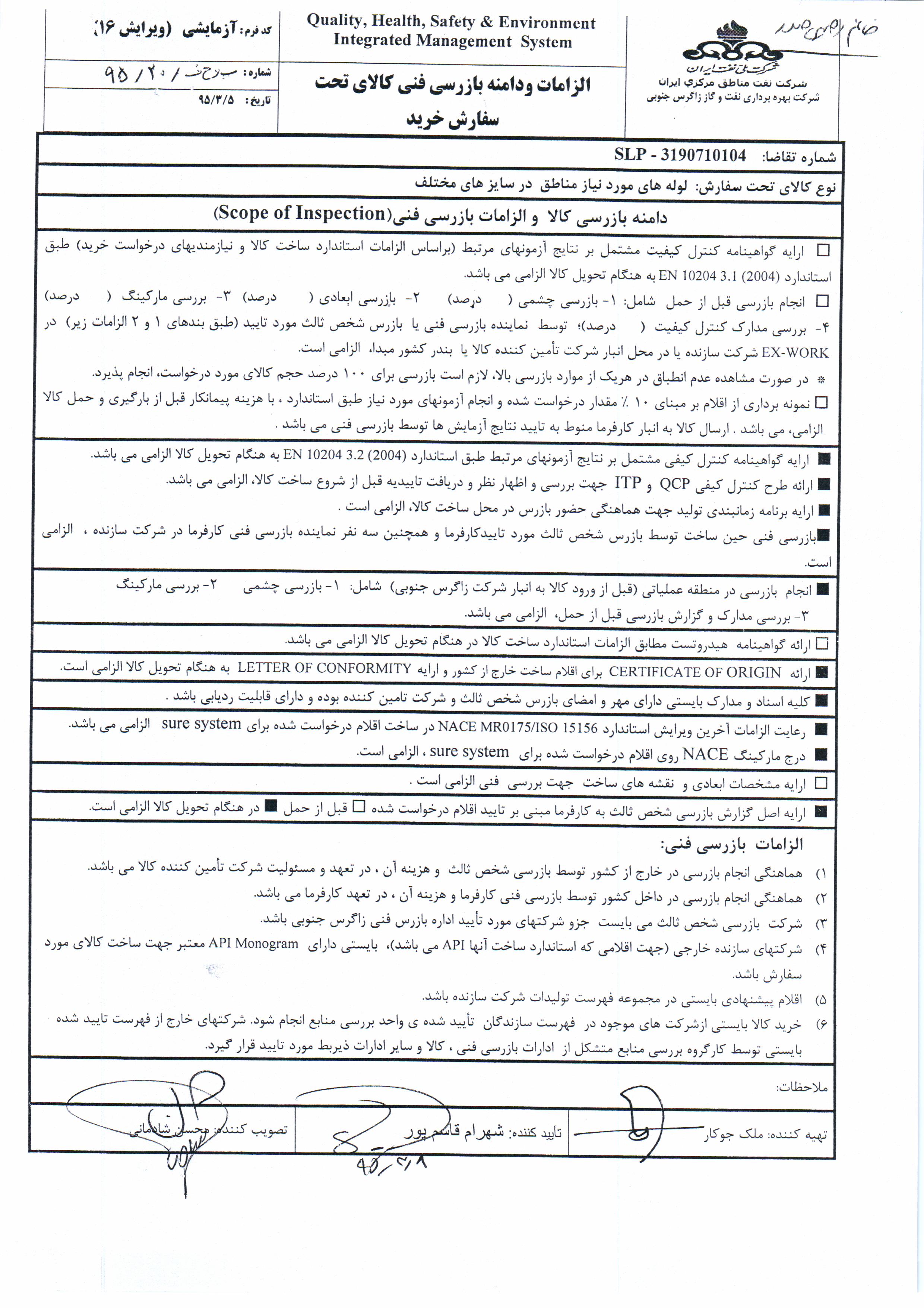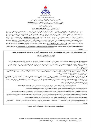 تقاضای خرید لوله های مورد نیاز جهت استفاده در مناطق مختلف عملیاتی نوع مناقصه شماره 95004 سازمان مرکزی شرکت بهره برداری نفت و گاز زاگرس جنوبی سازمان برگزار کننده شرکت بهره برداری نفت و گاز زاگرس جنوبی نوع برگزاری موضوع حوزه فعالیت توضیح مختصر قیمت پیوست 0 تومان وضعیت انقضا اطلاعات تکمیلی واحدپولی برآورد مالی ریال محدوده داخلی وضعیت برگزاری عادی اطلاعات اسناد مهلت دریافت سند ۲۲ خرداد ۱۳۹۵ ۱۱:۴۲ محل دریافت اسناد استان: فارس, شهر: شیراز در صورت ضرورت با شماره تلفن : ۳۲۱۳۸۴۳۶ و ۳۲۱۳۸۵۲۷-۰۷۱ تماس بگیرید و مکاتبات خود را به شماره :۰۷۱۳۲۳۱۴۴۴۷ ارسال نمایید. اطلاعات پیوست عنوان اندازه (KB) الزامات و دامنه بازرسی فنی 95004 902.50 منابع لوله 95004 27.50 شرایط عمومی و اختصاصی مناقصه 95004 2582.45 اسناد اعلام وصول مناقصه 95004 116.50