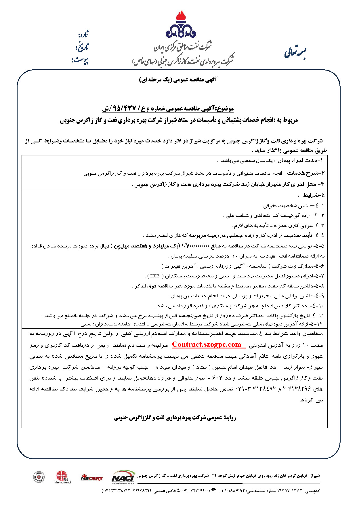 مربوط به :انجام خدمات پشتیبانی و تأسیسات در ستاد شیراز شرکت بهره برداری نفت و گاز زاگرس جنوبی نوع مناقصه شماره م ع/ 437/95 /ش سازمان مرکزی شرکت بهره برداری نفت و گاز زاگرس جنوبی سازمان برگزار کننده شرکت بهره برداری نفت و گاز زاگرس جنوبی نوع برگزاری موضوع حوزه فعالیت توضیح مختصر قیمت پیوست 0 تومان وضعیت انقضا اطلاعات تکمیلی واحدپولی برآورد مالی ریال محدوده داخلی وضعیت برگزاری عادی اطلاعات اسناد مهلت دریافت سند ۳۰ خرداد ۱۳۹۵ ۰۷:۰۷ محل دریافت اسناد استان: فارس, شهر: شیراز متقاضیان واجد شرایط بند 4 میبایست جهت اخذپرسشنامه و مدارک استعلام ارزیابی کیفی از اولین تاریخ درج آگهی در روزنامه به مدت 10 روز به آدرس اینترنتی contract.szogpc.com مراجعه و ثبت نام نمایند و پس از دریافت کد کاربری و رمز عبور و بارگزاری نامه اعلام آمادگی جهت مناقصه عطفی می بایست پرسشنامه تکمیل شده را تا تاریخ مشخص شده به نشانی شیراز- بلوار زند – حد فاصل میدان امام حسین ( ستاد ) و میدان شهداء – جنب کوچه پروانه – ساختمان شرکت بهره برداری نفت وگاز زاگرس جنوبی طبقه ششم واحد 607 - امور حقوقی و قراردادهاتحویل نمایند و برای اطلاعات بیشتر با شماره تلفن های 32138396 و 32138473-071 تماس حاصل نمایند. پس از بررسی پرسشنامه ها به واجدین شرایط مدارک مناقصه ارائه می گردد. اطلاعات پیوست