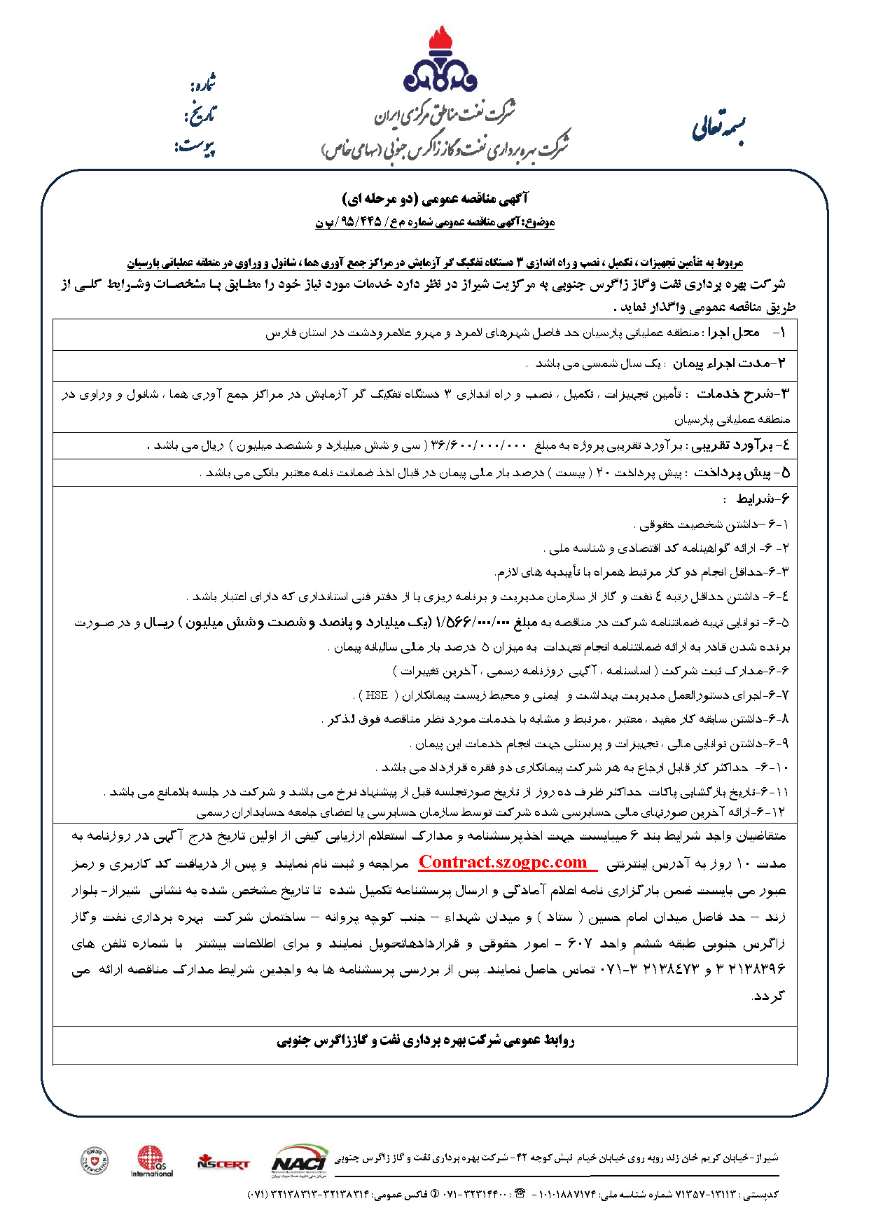 مربوط به :تأمین تجهیزات ، تکمیل ، نصب و راه اندازی 3 دستگاه تفکیک گر آزمایش در مراکز جمع آوری هما ، شانول و وراوی در منطقه عملیاتی پارسیان نوع مناقصه شماره م ع/ 445/95 /پ ن سازمان مرکزی شرکت بهره برداری نفت و گاز زاگرس جنوبی سازمان برگزار کننده شرکت بهره برداری نفت و گاز زاگرس جنوبی نوع برگزاری موضوع حوزه فعالیت توضیح مختصر قیمت پیوست 0 تومان وضعیت انقضا اطلاعات تکمیلی واحدپولی برآورد مالی ریال محدوده داخلی وضعیت برگزاری عادی اطلاعات اسناد مهلت دریافت سند ۳۰ خرداد ۱۳۹۵ ۰۷:۱۵ محل دریافت اسناد استان: فارس, شهر: شیراز متقاضیان واجد شرایط بند 6 میبایست جهت اخذپرسشنامه و مدارک استعلام ارزیابی کیفی از اولین تاریخ درج آگهی در روزنامه به مدت 10 روز به آدرس اینترنتی Contract.szogpc.com مراجعه و ثبت نام نمایند و پس از دریافت کد کاربری و رمز عبور می بایست ضمن بارگزاری نامه اعلام آمادگی و ارسال پرسشنامه تکمیل شده تا تاریخ مشخص شده به نشانی شیراز- بلوار زند – حد فاصل میدان امام حسین ( ستاد ) و میدان شهداء – جنب کوچه پروانه – ساختمان شرکت بهره برداری نفت وگاز زاگرس جنوبی طبقه ششم واحد 607 - امور حقوقی و قراردادهاتحویل نمایند و برای اطلاعات بیشتر با شماره تلفن های 32138396 و 32138473 -071 تماس حاصل نمایند. پس از بررسی پرسشنامه ها به واجدین شرایط مدارک مناقصه ارائه می گردد. اطلاعات پیوست