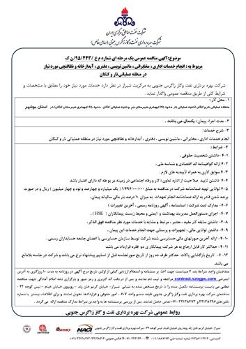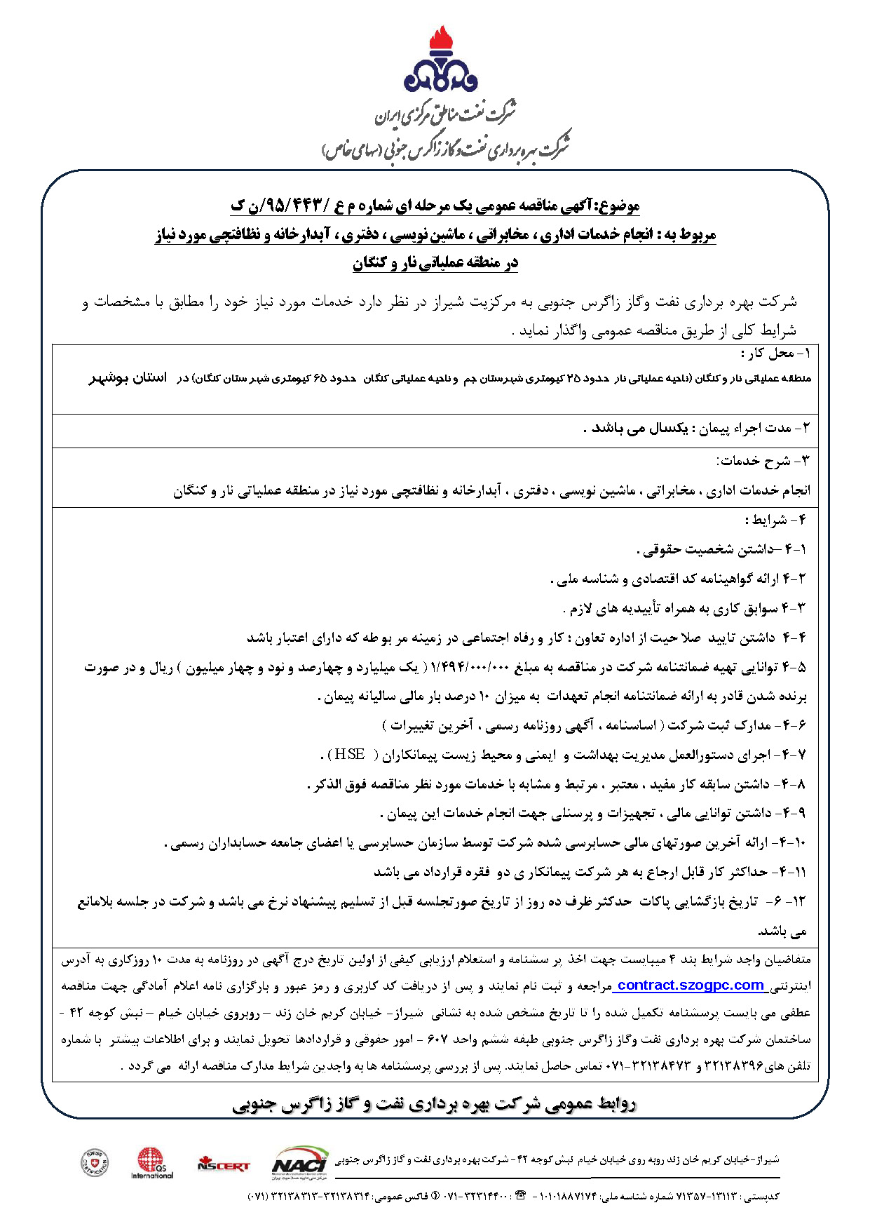 مربوط به : انجام خدمات اداری ، مخابراتی ، ماشین نویسی ، دفتری ، آبدارخانه و نظافتچی مورد نیاز در منطقه عملیاتی نار و کنگان نوع مناقصه شماره م ع /443/95/ن ک سازمان مرکزی شرکت بهره برداری نفت و گاز زاگرس جنوبی سازمان برگزار کننده شرکت بهره برداری نفت و گاز زاگرس جنوبی نوع برگزاری موضوع حوزه فعالیت توضیح مختصر قیمت پیوست 0 تومان وضعیت انقضا اطلاعات تکمیلی واحدپولی برآورد مالی ریال محدوده داخلی وضعیت برگزاری عادی اطلاعات اسناد مهلت دریافت سند ۳۰ خرداد ۱۳۹۵ ۰۷:۴۱ محل دریافت اسناد استان: فارس, شهر: شیراز متقاضیان واجد شرایط بند 4 میبایست جهت اخذ پر سشنامه و استعلام ارزیابی کیفی از اولین تاریخ درج آگهی در روزنامه به مدت 10 روزکاری به آدرس اینترنتی contract.szogpc.com مراجعه و ثبت نام نمایند و پس از دریافت کد کاربری و رمز عبور و بارگزاری نامه اعلام آمادگی جهت مناقصه عطفی می بایست پرسشنامه تکمیل شده را تا تاریخ مشخص شده به نشانی شیراز- خیابان کریم خان زند – روبروی خیابان خیام – نبش کوچه 42 - ساختمان شرکت بهره برداری نفت وگاز زاگرس جنوبی طبقه ششم واحد 607 - امور حقوقی و قراردادها تحویل نمایند و برای اطلاعات بیشتر با شماره تلفن های32138396 و 32138473-071 تماس حاصل نمایند. پس از بررسی پرسشنامه ها به واجدین شرایط مدارک مناقصه ارائه می گردد . اطلاعات پیوست