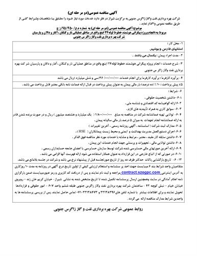 مربوط به :انجام پروژه پیگرانی هوشمند خطوط لوله 24 اینچ واقع در مناطق عملیاتی نار و کنگان ،آغار و دالان و پارسیان شرکت بهر ه برداری نفت وگاز زاکرس جنوبی نوع مناقصه شماره م ع/ 450/95/ز ج سازمان مرکزی شرکت بهره برداری نفت و گاز زاگرس جنوبی سازمان برگزار کننده شرکت بهره برداری نفت و گاز زاگرس جنوبی نوع برگزاری موضوع حوزه فعالیت توضیح مختصر قیمت پیوست 0 تومان وضعیت انقضا اطلاعات تکمیلی واحدپولی برآورد مالی ریال محدوده داخلی وضعیت برگزاری عادی اطلاعات اسناد مهلت دریافت سند ۳۰ خرداد ۱۳۹۵ ۰۸:۱۵ محل دریافت اسناد استان: فارس, شهر: شیراز متقاضیان واجد شرایط بند 6 میبایست جهت اخذ پر سشنامه و استعلام ارزیابی کیفی از اولین تاریخ درج آگهی در روزنامه به مدت 10 روزکاری به آدرس اینترنتی contract.szogpc.com مراجعه و ثبت نام نمایند و پس از دریافت کد کاربری و رمز عبورمیبایست ضمن بارگزاری نامه اعلام آمادگی در سایت وهمچنین ارسال پرسشنامه تکمیل شده تا تاریخ مشخص شده به نشانی شیراز- خیابان کریم خان زند – روبروی خیابان خیام – نبش کوچه 42 - ساختمان شرکت بهره برداری نفت وگاز زاگرس جنوبی طبقه ششم واحد 607 - امور حقوقی و قراردادها تحویل نمایند و برای اطلاعات بیشتر با شماره تلفن های32138396 و 32138473-071 تماس حاصل نمایند. پس از بررسی پرسشنامه ها به واجدین شرایط مدارک مناقصه ارائه می گردد . اطلاعات پیوست
