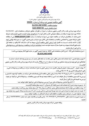 تقاضای خرید SLICKLINE WIRE مورد نیاز جهت استفاده در منطقه عملیاتی آغار و دالان نوع مناقصه شماره 95005 سازمان مرکزی شرکت بهره برداری نفت و گاز زاگرس جنوبی سازمان برگزار کننده شرکت بهره برداری نفت و گاز زاگرس جنوبی نوع برگزاری موضوع حوزه فعالیت توضیح مختصر قیمت پیوست 0 تومان وضعیت انقضا اطلاعات تکمیلی واحدپولی برآورد مالی ریال محدوده داخلی وضعیت برگزاری عادی اطلاعات اسناد مهلت دریافت سند ۱۳ تیر ۱۳۹۵ ۰۹:۴۳ محل دریافت اسناد استان: فارس, شهر: شیراز در صورت ضرورت با شماره تلفن : ۳۲۱۳۸۴۳۶ و ۳۲۱۳۸۴۰۲-۰۷۱ تماس بگیرید و مکاتبات خود را به شماره :۰۷۱۳۲۳۱۴۴۴۷ ارسال نمایید. اطلاعات پیوست عنوان اندازه (KB) شرایط عمومی و اختصاصی مناقصه 95005 1053.09 اسناد فرم اعلام وصول مناقصه 95005 117.00