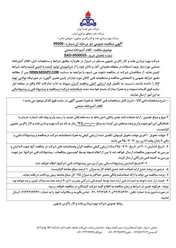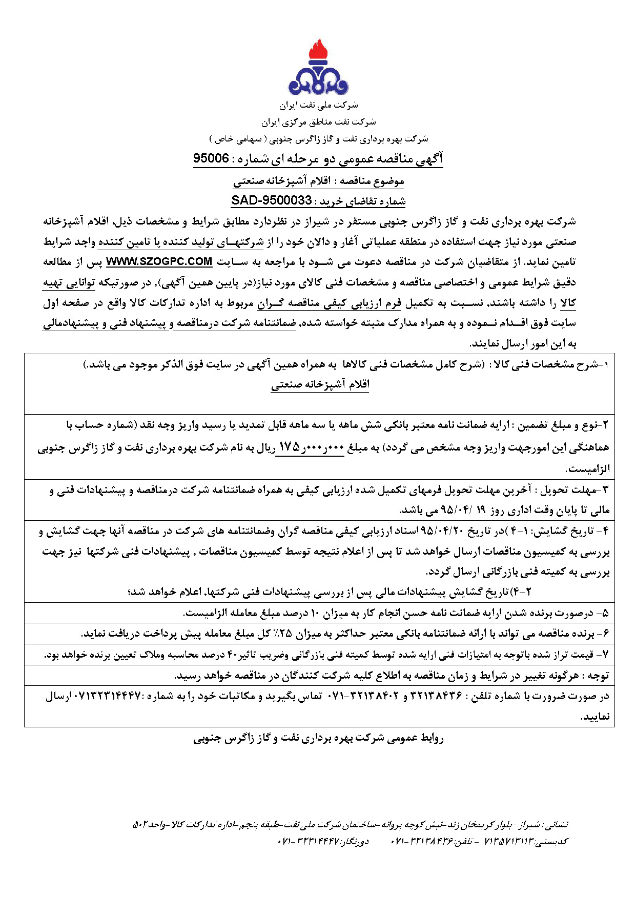 تقاضای خرید اقلام آشپزخانه صنعتی مورد نیاز جهت استفاده در منطقه عملیاتی آغار و دالان نوع مناقصه شماره 95006 سازمان مرکزی شرکت بهره برداری نفت و گاز زاگرس جنوبی سازمان برگزار کننده شرکت بهره برداری نفت و گاز زاگرس جنوبی نوع برگزاری موضوع حوزه فعالیت توضیح مختصر قیمت پیوست 0 تومان وضعیت انقضا اطلاعات تکمیلی واحدپولی برآورد مالی ریال محدوده داخلی وضعیت برگزاری عادی اطلاعات اسناد مهلت دریافت سند ۱۹ تیر ۱۳۹۵ ۱۰:۰۰ محل دریافت اسناد استان: فارس, شهر: شیراز در صورت ضرورت با شماره تلفن : ۳۲۱۳۸۴۳۶ و ۳۲۱۳۸۴۰۲-۰۷۱ تماس بگیرید و مکاتبات خود را به شماره :۰۷۱۳۲۳۱۴۴۴۷ ارسال نمایید. اطلاعات پیوست عنوان اندازه (KB) شرایط عمومی و اختصاصی مناقصه 95006 2227.51 اسناد اعلام وصول مناقصه 95006 117.00