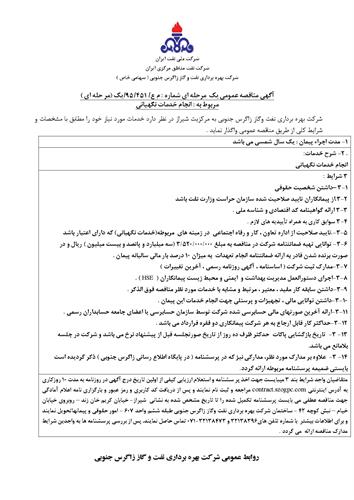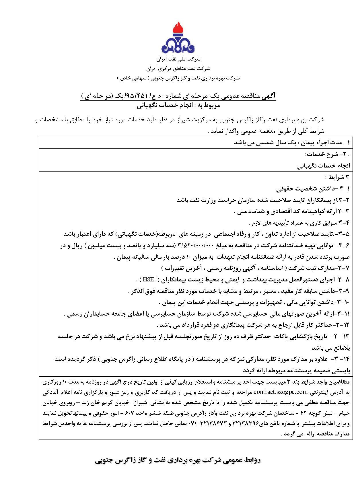 متقاضیان واجد شرایط بند 3 میبایست جهت اخذ پر سشنامه و استعلام ارزیابی کیفی از اولین تاریخ درج آگهی در روزنامه به مدت 10 روزکاری به آدرس اینترنتی contract.szogpc.com مراجعه و ثبت نام نمایند و پس از دریافت کد کاربری و رمز عبور و بارگزاری نامه اعلام آمادگی جهت مناقصه عطفی می بایست پرسشنامه تکمیل شده را تا تاریخ مشخص شده به نشانی شیراز- خیابان کریم خان زند – روبروی خیابان خیام – نبش کوچه 42 - ساختمان شرکت بهره برداری نفت وگاز زاگرس جنوبی طبقه ششم واحد 607 - امور حقوقی و پیمانهاتحویل نمایند و برای اطلاعات بیشتر با شماره تلفن های32138396 و 32138473-071 تماس حاصل نمایند. پس از بررسی پرسشنامه ها به واجدین شرایط مدارک مناقصه ارائه می گردد .