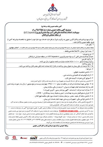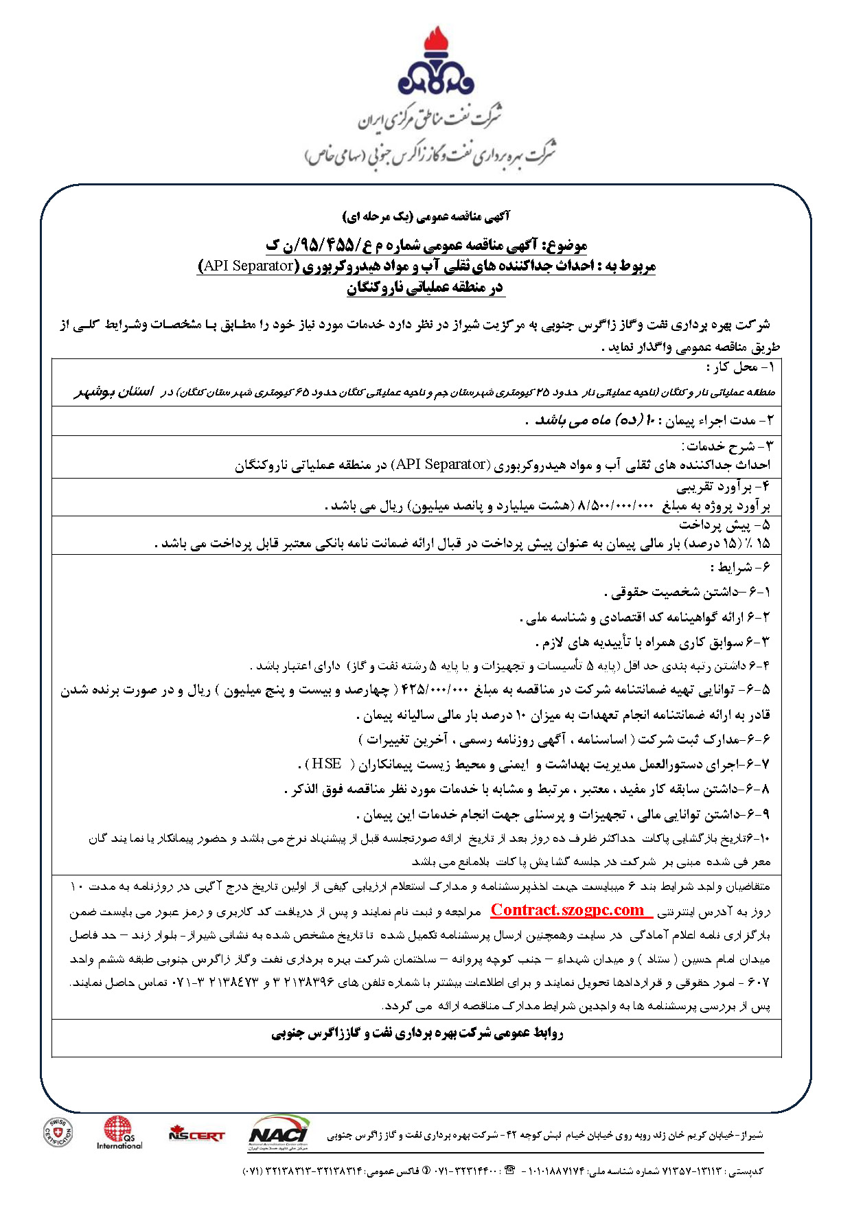 احداث جداکننده های ثقلی آب و مواد هیدروکربوری (API Separator) در منطقه عملیاتی ناروکنگان نوع مناقصه شماره م ع/۴۵۵/۹۵/ن ک سازمان مرکزی شرکت بهره برداری نفت و گاز زاگرس جنوبی سازمان برگزار کننده شرکت بهره برداری نفت و گاز زاگرس جنوبی نوع برگزاری موضوع حوزه فعالیت توضیح مختصر قیمت پیوست 0 تومان وضعیت انقضا اطلاعات تکمیلی واحدپولی برآورد مالی ریال محدوده داخلی وضعیت برگزاری عادی اطلاعات اسناد محل دریافت اسناد استان: فارس, شهر: شیراز متقاضیان واجد شرایط بند 6 میبایست جهت اخذپرسشنامه و مدارک استعلام ارزیابی کیفی از اولین تاریخ درج آگهی در روزنامه به مدت 10 روز به آدرس اینترنتی Contract.szogpc.com مراجعه و ثبت نام نمایند و پس از دریافت کد کاربری و رمز عبور می بایست ضمن بارگزاری نامه اعلام آمادگی در سایت وهمچنین ارسال پرسشنامه تکمیل شده تا تاریخ مشخص شده به نشانی شیراز- بلوار زند – حد فاصل میدان امام حسین ( ستاد ) و میدان شهداء – جنب کوچه پروانه – ساختمان شرکت بهره برداری نفت وگاز زاگرس جنوبی طبقه ششم واحد 607 - امور حقوقی و قراردادها تحویل نمایند و برای اطلاعات بیشتر با شماره تلفن های 2138396 3 و 2138473 3-071 تماس حاصل نمایند. پس از بررسی پرسشنامه ها به واجدین شرایط مدارک مناقصه ارائه می گردد. اطلاعات پیوست