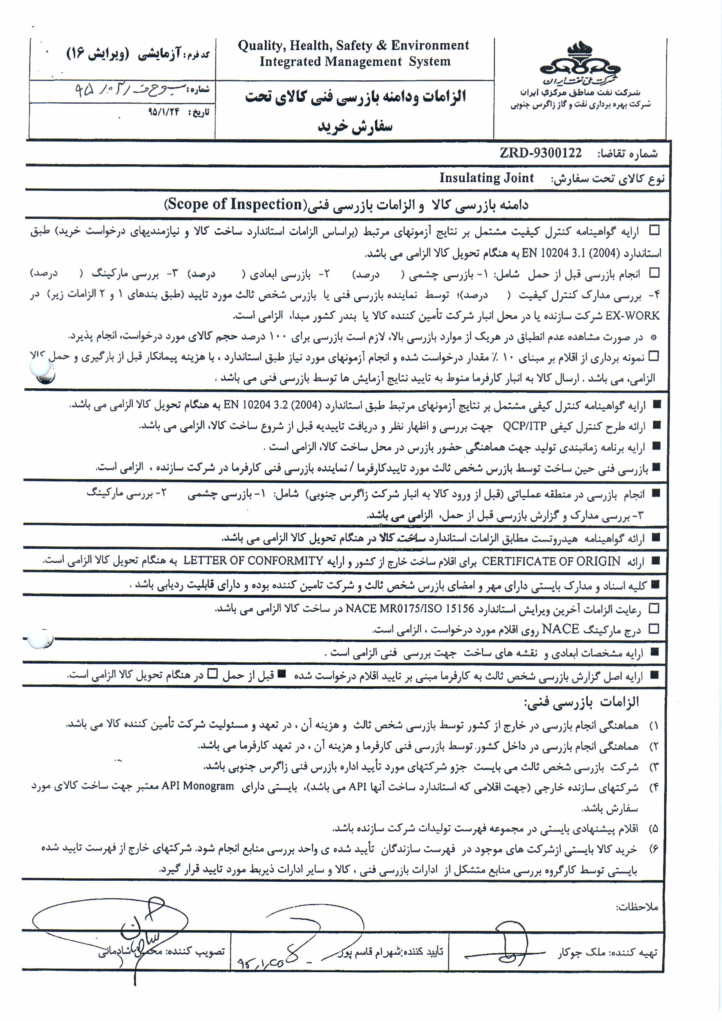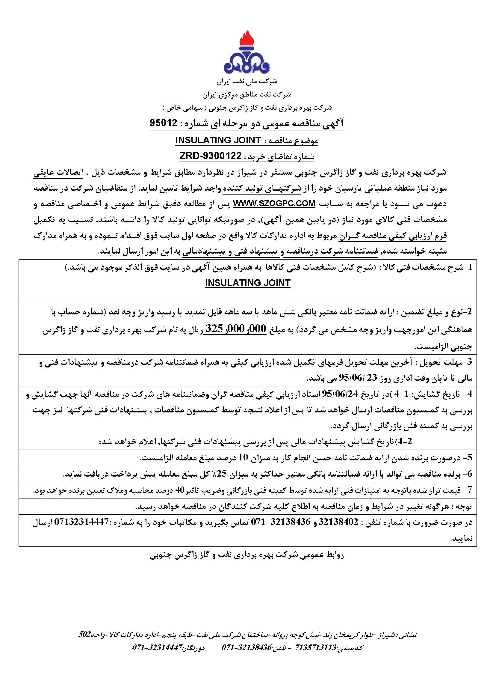 تقاضای خرید اتصالات عایقی مورد نیاز منطقه عملیاتی پارسیان نوع مناقصه شماره ۹۵۰۱۲ سازمان مرکزی شرکت بهره برداری نفت و گاز زاگرس جنوبی سازمان برگزار کننده شرکت بهره برداری نفت و گاز زاگرس جنوبی نوع برگزاری موضوع حوزه فعالیت توضیح مختصر قیمت پیوست 0 تومان وضعیت انقضا اطلاعات تکمیلی واحدپولی برآورد مالی ریال محدوده داخلی وضعیت برگزاری عادی اطلاعات اسناد مهلت دریافت سند ۲۳ شهریور ۱۳۹۵ ۲۲:۴۱ محل دریافت اسناد استان: فارس, شهر: شیراز در صورت ضرورت با شماره تلفن : 32138402 و 32138436-071 تماس بگیرید و مکاتبات خود را به شماره :07132314447 ارسال نمایید. اطلاعات پیوست عنوان اندازه (KB) الزامات و دامنه بازرسی فنی کالا 967.29 شرایط عمومی و اختصاصی مناقصه 95012 2273.64 اسناد فرم اعلام وصول مناقصه 95012 117.00