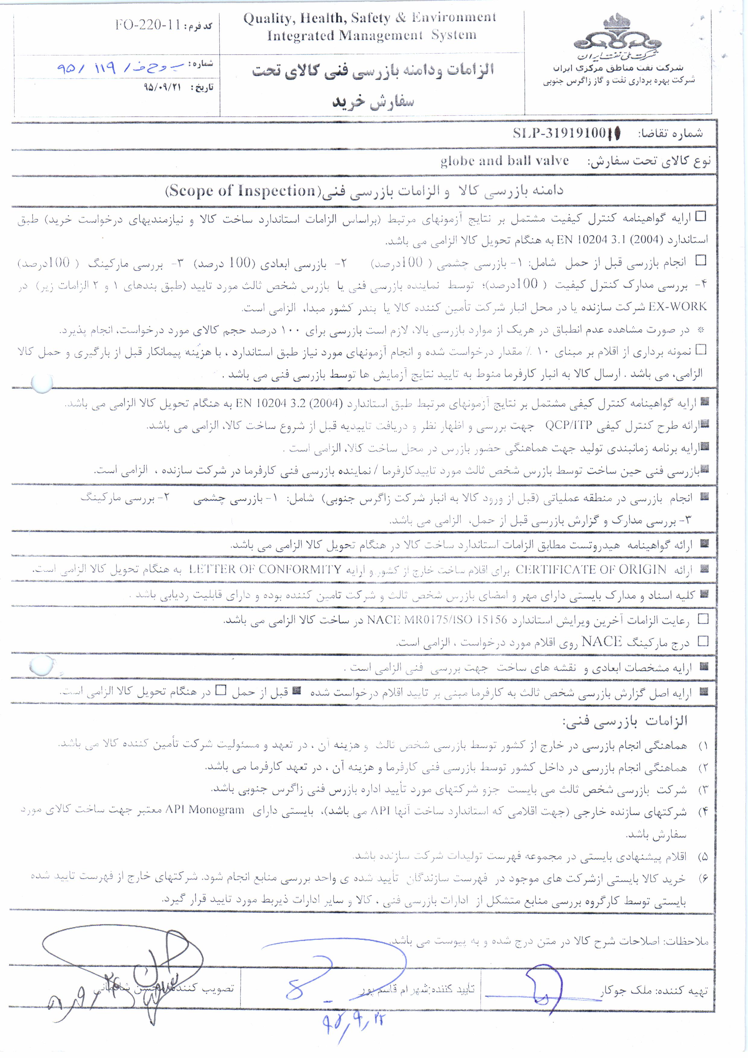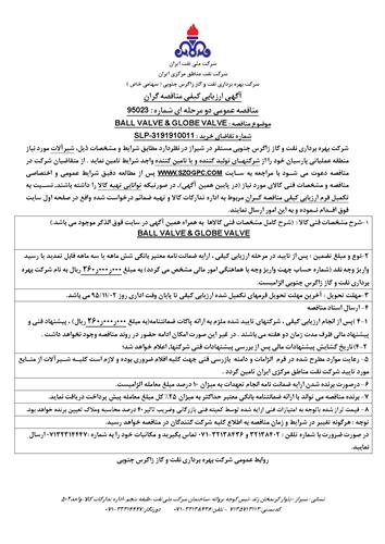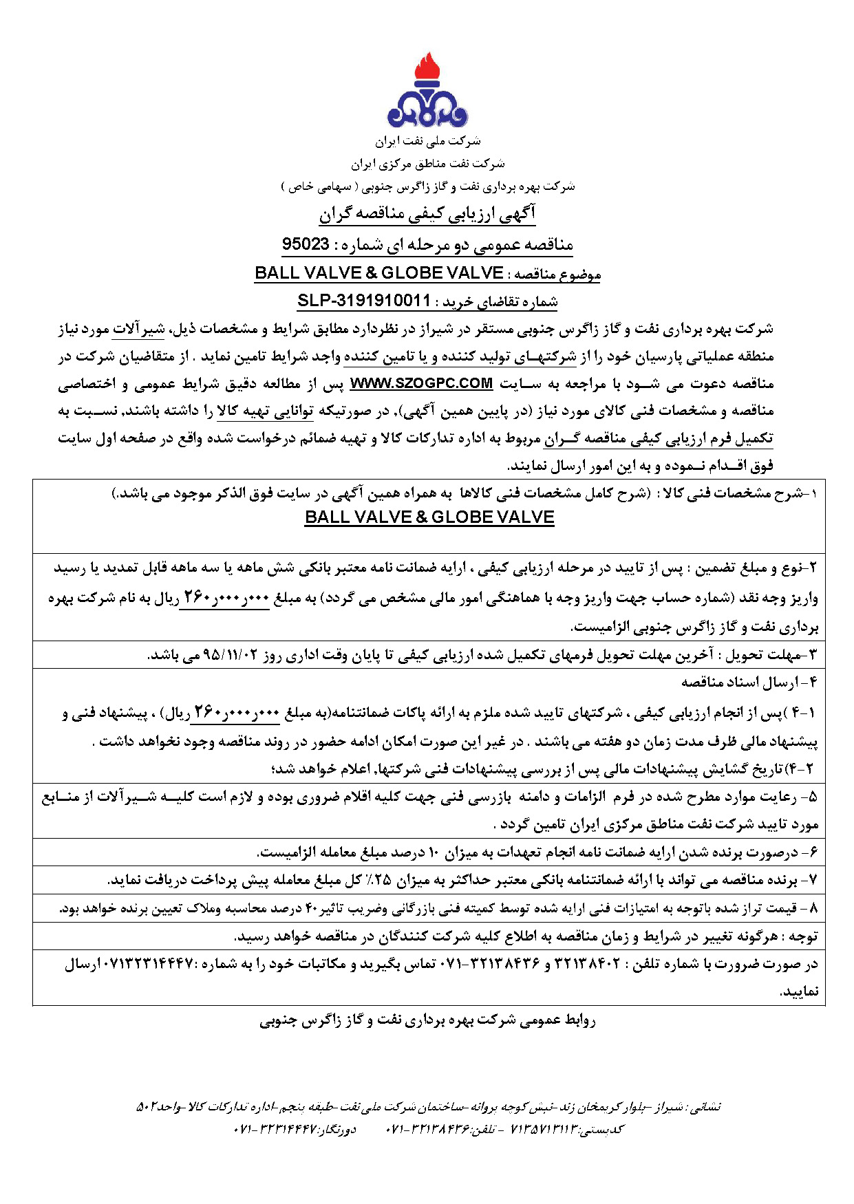تقاضای خرید شیرآلات مورد نیاز منطقه عملیاتی پارسیان نوع مناقصه شماره 95023 سازمان مرکزی شرکت بهره برداری نفت و گاز زاگرس جنوبی سازمان برگزار کننده شرکت بهره برداری نفت و گاز زاگرس جنوبی نوع برگزاری موضوع حوزه فعالیت توضیح مختصر قیمت پیوست 0 تومان وضعیت انقضا اطلاعات تکمیلی واحدپولی برآورد مالی ریال محدوده داخلی وضعیت برگزاری عادی اطلاعات اسناد مهلت دریافت سند ۲ بهمن ۱۳۹۵ ۱۴:۱۲ محل دریافت اسناد استان: فارس, شهر: شیراز در صورت ضرورت با شماره تلفن : 32138402 و 32138436-071 تماس بگیرید و مکاتبات خود را به شماره :07132314447 ارسال نمایید. اطلاعات پیوست عنوان اندازه (KB) فرم الزامات و دامنه بازرسی فنی 95023 837.45 لیست منابع مورد تایید جهت تامین شیرآلات 1212.44 دیتا شیت مناقصه 95023 4974.25 اسناد فرم اعلام وصول مناقصه 95023 117.50 شرایط عمومی و اختصاصی مناقصه 95023 3176.29