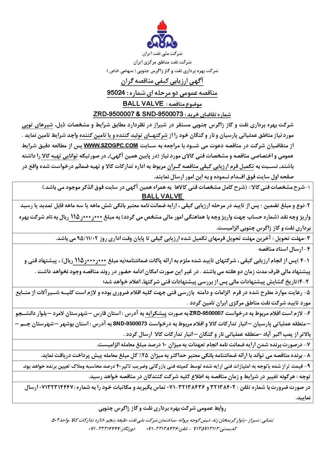 تقاضای خرید شیرهای توپی مورد نیاز مناطق عملیاتی پارسیان و نار و کنگان نوع مناقصه شماره 95024 سازمان مرکزی شرکت بهره برداری نفت و گاز زاگرس جنوبی سازمان برگزار کننده شرکت بهره برداری نفت و گاز زاگرس جنوبی نوع برگزاری موضوع حوزه فعالیت توضیح مختصر قیمت پیوست 0 تومان وضعیت انقضا اطلاعات تکمیلی واحدپولی برآورد مالی ریال محدوده داخلی وضعیت برگزاری عادی اطلاعات اسناد مهلت دریافت سند ۲ بهمن ۱۳۹۵ ۰۹:۴۷ محل دریافت اسناد استان: فارس, شهر: شیراز در صورت ضرورت با شماره تلفن : 32138402 و 32138436-071 تماس بگیرید و مکاتبات خود را به شماره :07132314447 ارسال نمایید. اطلاعات پیوست عنوان اندازه (KB) لیست منابع مورد تایید جهت تامین شیرآلات 1212.44 دیتا شیت مناقصه 95024 9974.32 فرم الزامات و دامنه بازرسی فنی مناقصه 95024 1817.80 شرایط عمومی و اختصاصی مناقصه 95024 3746.25 اسناد فرم اعلام وصول مناقصه 95024 117.50