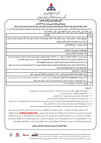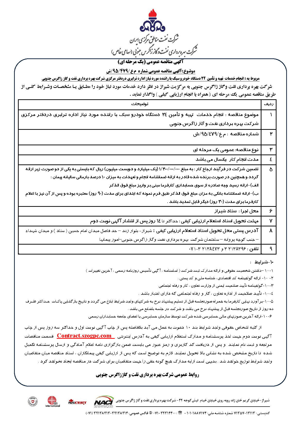 مربوط به : انجام خدمات تهیه و تأمین 24 دستگاه خودرو سبک با راننده مورد نیاز اداره ترابری دردفتر مرکزی شرکت بهره برداری نفت و گاز زاگرس جنوبی نوع مناقصه شماره م ع/۴۷۹/۹۵/ش سازمان مرکزی شرکت بهره برداری نفت و گاز زاگرس جنوبی سازمان برگزار کننده شرکت بهره برداری نفت و گاز زاگرس جنوبی نوع برگزاری موضوع حوزه فعالیت توضیح مختصر قیمت پیوست 0 تومان وضعیت انقضا اطلاعات تکمیلی واحدپولی برآورد مالی ریال محدوده داخلی وضعیت برگزاری عادی اطلاعات اسناد مهلت دریافت سند ۲۰ بهمن ۱۳۹۵ ۱۶:۰۰ محل دریافت اسناد استان: فارس, شهر: شیراز از کلیه اشخاص حقوقی واجد شرایط بند 10 دعوت به عمل می آید بلافاصله پس از چاپ آگهی نوبت اول و حداکثر سه روز پس از چاپ آگهی نوبت دوم جهت اخذ پرسشنامه و مدارک استعلام ارزیابی کیفی به آدرس اینترنتی Contract.szogpc.com قسمت مناقصات مراجعه و ثبت نام نمایند و پس از دریافت کد کاربری و رمز عبور می بایست ضمن بارگزاری نامه اعلام آمادگی و ارسال پرسشنامه تکمیل شده تا تاریخ مشخص شده به نشانی بالا تحویل نمایند. لازم به توضیح است که پس از ارزیابی کیفی پیمانکاران ، اسناد مناقصه میان متقاضیان واجد شرایط توزیع خواهد شد . بدیهی است ارایه مدارک هیچ گونه حقی را جهت متقاضیان برای شرکت در مناقصه ایجاد نخواهد کرد . اطلاعات پیوست