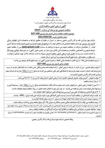 تقاضای خرید قطعات یدکی کنترل پنل توربین SGT-400 مورد نیاز منطقه عملیاتی نار و کنگان نوع مناقصه شماره 95031 سازمان مرکزی شرکت بهره برداری نفت و گاز زاگرس جنوبی سازمان برگزار کننده شرکت بهره برداری نفت و گاز زاگرس جنوبی نوع برگزاری موضوع حوزه فعالیت توضیح مختصر قیمت پیوست 0 تومان وضعیت انقضا اطلاعات تکمیلی واحدپولی برآورد مالی ریال محدوده داخلی وضعیت برگزاری عادی اطلاعات اسناد مهلت دریافت سند ۷ اسفند ۱۳۹۵ ۰۹:۱۲ محل دریافت اسناد استان: فارس, شهر: شیراز در صورت ضرورت با شماره تلفن : 32138402 و 32138436-071 تماس بگیرید و مکاتبات خود را به شماره :07132314447 ارسال نمایید. اطلاعات پیوست عنوان اندازه (KB) شرایط عمومی و اختصاصی مناقصه 95031 1917.88 اسناد فرم اعلام وصول مناقصه 95031 117.50