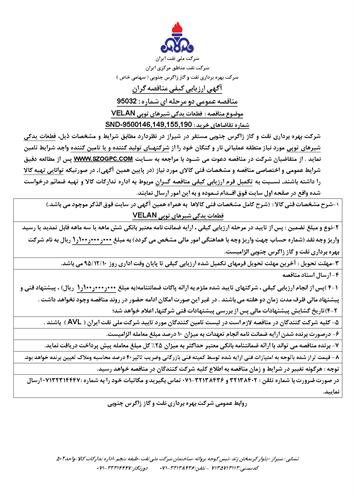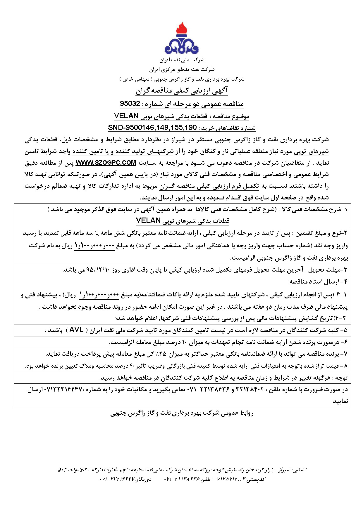 تقاضاهای خرید قطعات یدکی شیرهای توپی VELAN مورد نیاز منطقه عملیاتی نار و کنگان نوع مناقصه شماره 95032 سازمان مرکزی شرکت بهره برداری نفت و گاز زاگرس جنوبی سازمان برگزار کننده شرکت بهره برداری نفت و گاز زاگرس جنوبی نوع برگزاری موضوع حوزه فعالیت توضیح مختصر قیمت پیوست 0 تومان وضعیت انقضا اطلاعات تکمیلی واحدپولی برآورد مالی ریال محدوده داخلی وضعیت برگزاری عادی اطلاعات اسناد مهلت دریافت سند ۱۰ اسفند ۱۳۹۵ ۰۹:۱۷ محل دریافت اسناد استان: فارس, شهر: شیراز در صورت ضرورت با شماره تلفن : 32138402 و 32138436-071 تماس بگیرید و مکاتبات خود را به شماره :07132314447 ارسال نمایید. اطلاعات پیوست عنوان اندازه (KB) مشخصات فنی 95032 13697.42 شرایط عمومی و اختصاصی مناقصه 95032 6434.53 اسناد فرم اعلام وصول مناقصه 95032 117.50