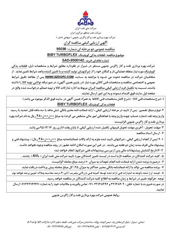 تقاضای خرید قطعات یدکی کوپلینگ BIBY TURBOFLEX مورد نیاز منطقه عملیاتی نار و کنگان نوع مناقصه شماره 95038 سازمان مرکزی شرکت بهره برداری نفت و گاز زاگرس جنوبی سازمان برگزار کننده شرکت بهره برداری نفت و گاز زاگرس جنوبی نوع برگزاری موضوع حوزه فعالیت توضیح مختصر قیمت پیوست 0 تومان وضعیت انقضا اطلاعات تکمیلی واحدپولی برآورد مالی ریال محدوده داخلی وضعیت برگزاری عادی اطلاعات اسناد مهلت دریافت سند ۱۴ اسفند ۱۳۹۵ ۱۵:۰۲ محل دریافت اسناد استان: فارس, شهر: شیراز در صورت ضرورت با شماره تلفن : 32138402 و 32138436-071 تماس بگیرید و مکاتبات خود را به شماره :07132314447 ارسال نمایید. اطلاعات پیوست عنوان اندازه (KB) مشخصات فنی 95038 1656.03 شرایط عمومی و اختصاصی مناقصه 95038 1383.76 اسناد فرم اعلام وصول مناقصه 95038 117.50