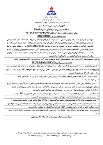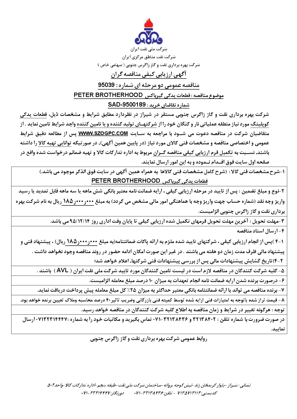 تقاضای خرید قطعات یدکی گیرباکس PETER BROTHERHOOD مورد نیاز منطقه عملیاتی نار و کنگان نوع مناقصه شماره 95039 سازمان مرکزی شرکت بهره برداری نفت و گاز زاگرس جنوبی سازمان برگزار کننده شرکت بهره برداری نفت و گاز زاگرس جنوبی نوع برگزاری موضوع حوزه فعالیت توضیح مختصر قیمت پیوست 0 تومان وضعیت انقضا اطلاعات تکمیلی واحدپولی برآورد مالی ریال محدوده داخلی وضعیت برگزاری عادی اطلاعات اسناد مهلت دریافت سند ۱۴ اسفند ۱۳۹۵ ۱۵:۰۹ محل دریافت اسناد استان: فارس, شهر: شیراز در صورت ضرورت با شماره تلفن : 32138402 و 32138436-071 تماس بگیرید و مکاتبات خود را به شماره :07132314447 ارسال نمایید. اطلاعات پیوست عنوان اندازه (KB) مشخصات فنی 95039 2940.54 شرایط عمومی و اختصاصی مناقصه 95039 1998.48 اسناد فرم اعلام وصول مناقصه 95039 117.50