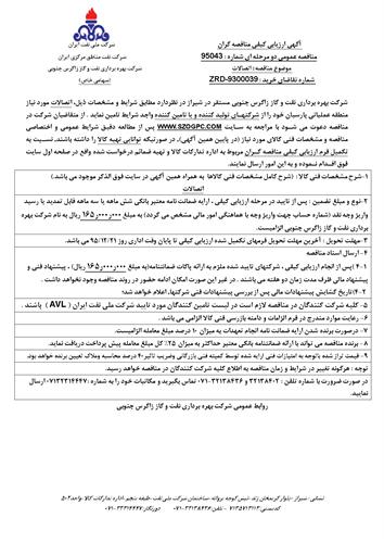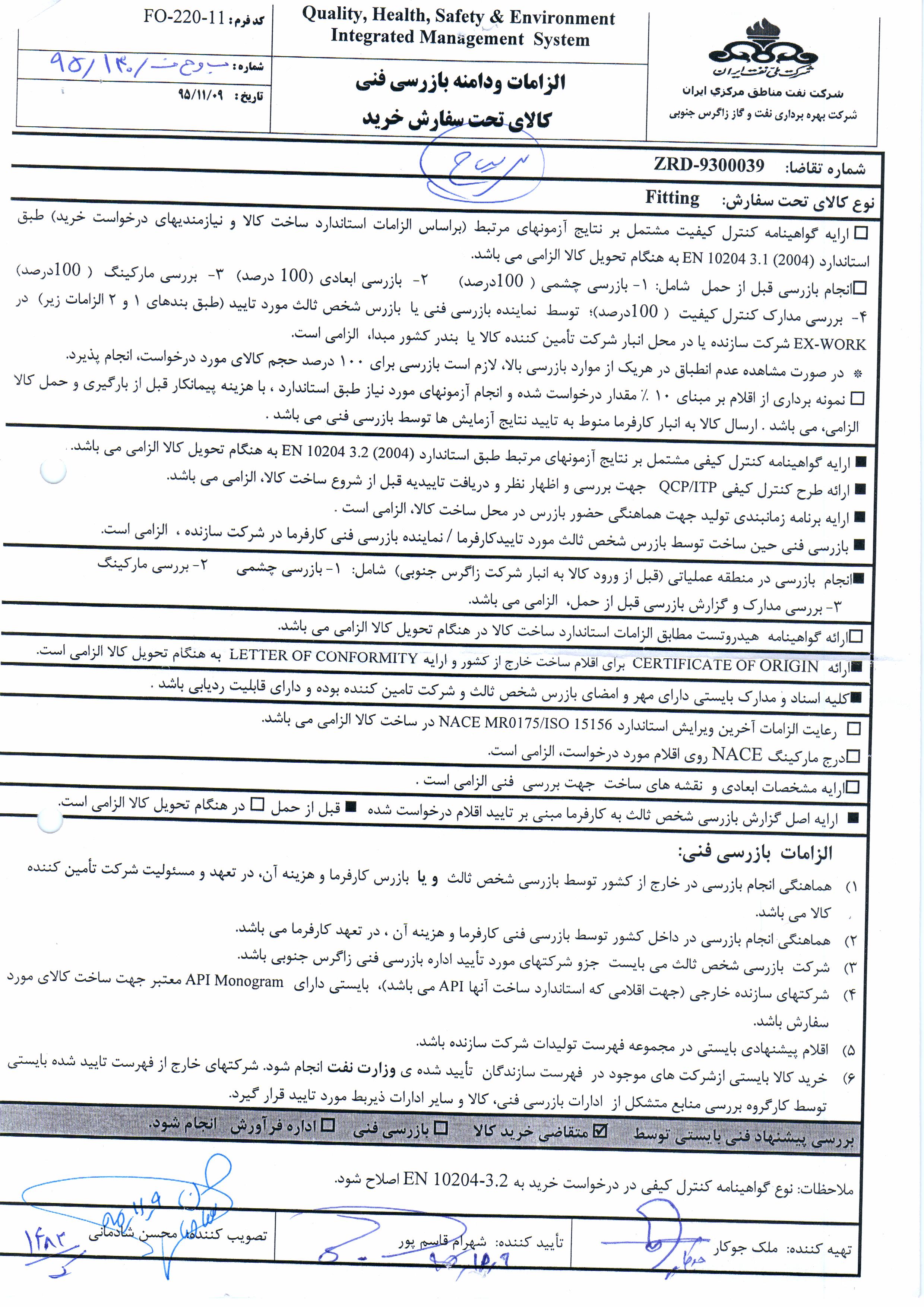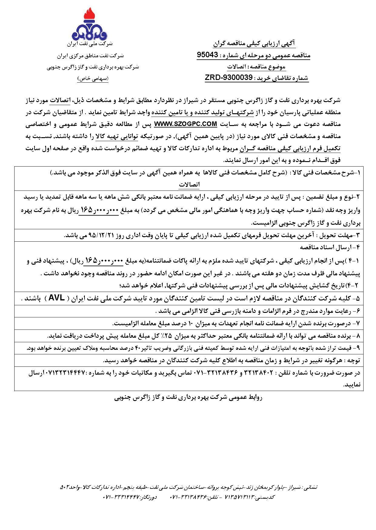تقاضای خرید اتصالات مورد نیاز منطقه عملیاتی پارسیان نوع مناقصه شماره 95043 سازمان مرکزی شرکت بهره برداری نفت و گاز زاگرس جنوبی سازمان برگزار کننده شرکت بهره برداری نفت و گاز زاگرس جنوبی نوع برگزاری موضوع حوزه فعالیت توضیح مختصر قیمت پیوست 0 تومان وضعیت انقضا اطلاعات تکمیلی واحدپولی برآورد مالی ریال محدوده داخلی وضعیت برگزاری عادی اطلاعات اسناد مهلت دریافت سند ۲۱ اسفند ۱۳۹۵ ۱۲:۱۶ محل دریافت اسناد استان: فارس, شهر: شیراز در صورت ضرورت با شماره تلفن : 32138402 و 32138436-071 تماس بگیرید و مکاتبات خود را به شماره :07132314447 ارسال نمایید. اطلاعات پیوست عنوان اندازه (KB) لیستن منابع خارجی مورد تایید اتصالات 95043 695.54 فرم الزامات و دامنه بازرسی فنی 95043 1110.82 شرایط عمومی و اختصاصی مناقصه 95043 3289.08 اسناد فرم اعلام وصول مناقصه 95043 117.50