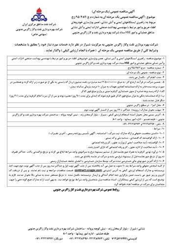 راهبری ایستگاههای ایمنی و آتش نشانی، تعمیر وبازسازی خودروهای اطفاء حریق و امور مرتبط با مهندسی بهداشت صنعتی ادارات ایمنی وآتش نشانی مناطق عملیاتی و امور HSE ستاد شرکت بهره برداری نفت و گاز زاگرس جنوبی نوع مناقصه شماره م ع/482/95/زج سازمان مرکزی شرکت بهره برداری نفت و گاز زاگرس جنوبی سازمان برگزار کننده شرکت بهره برداری نفت و گاز زاگرس جنوبی نوع برگزاری موضوع حوزه فعالیت توضیح مختصر قیمت پیوست 0 تومان وضعیت انقضا اطلاعات تکمیلی واحدپولی برآورد مالی ریال محدوده داخلی وضعیت برگزاری عادی اطلاعات اسناد مهلت دریافت سند ۳۰ اسفند ۱۳۹۵ ۱۰:۰۲ محل دریافت اسناد استان: فارس, شهر: شیراز از کلیه اشخاص حقوقی واجد شرایط بند 10 دعوت به عمل می آید بلافاصله پس از چاپ آگهی نوبت اول و حداکثر سه روز پس از چاپ آگهی نوبت دوم جهت اخذ پرسشنامه و مدارک استعلام ارزیابی کیفی به آدرس اینترنتی contract.szogpc.com قسمت مناقصات مراجعه و ثبت نام نمایند و پس از دریافت کد کاربری و رمز عبور می بایست ضمن بارگزاری نامه اعلام آمادگی و ارسال پرسشنامه تکمیل شده تا تاریخ مشخص شده به نشانی بالا تحویل نمایند. لازم به توضیح است که پس از ارزیابی کیفی پیمانکاران ، اسناد مناقصه میان متقاضیان واجد شرایط توزیع خواهد شد . بدیهی است ارایه مدارک هیچ گونه حقی را جهت متقاضیان برای شرکت در مناقصه ایجاد نخواهد کرد. اطلاعات پیوست